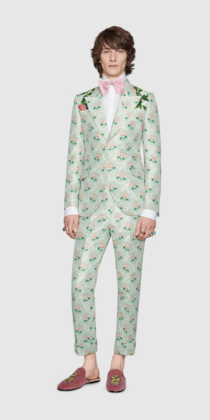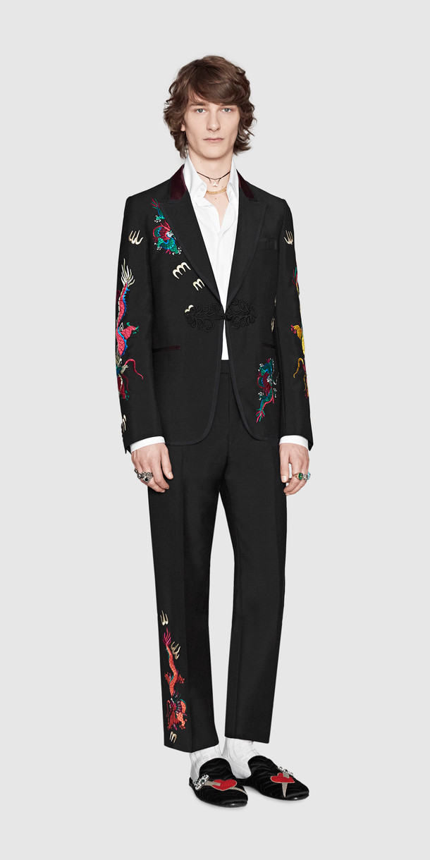 As you can see from the prints on the womenswear collection the animal prints are larger in scale. It consists of animals and an insect we tend to see during the spring and summer season. The embroidery on the menswear collection are in a smaller scale and more displaced around the suit, as well as the shoes. The embroidery is of a traditional dragon varying in sizes.