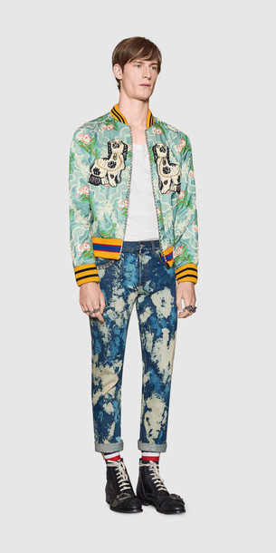 Just as we have seen with all the womenswear collection the designs of the prints and embroideries have been on a large scale. The two dogs pretty much almost covers the front of the jacket. I love the colours that have been used in that outfit. As we can see from the menswear outfit the dogs are smaller and they have been embroidered on a floral print bomber jacket. I think the whole outfit looks fun, which is what the summer is about.