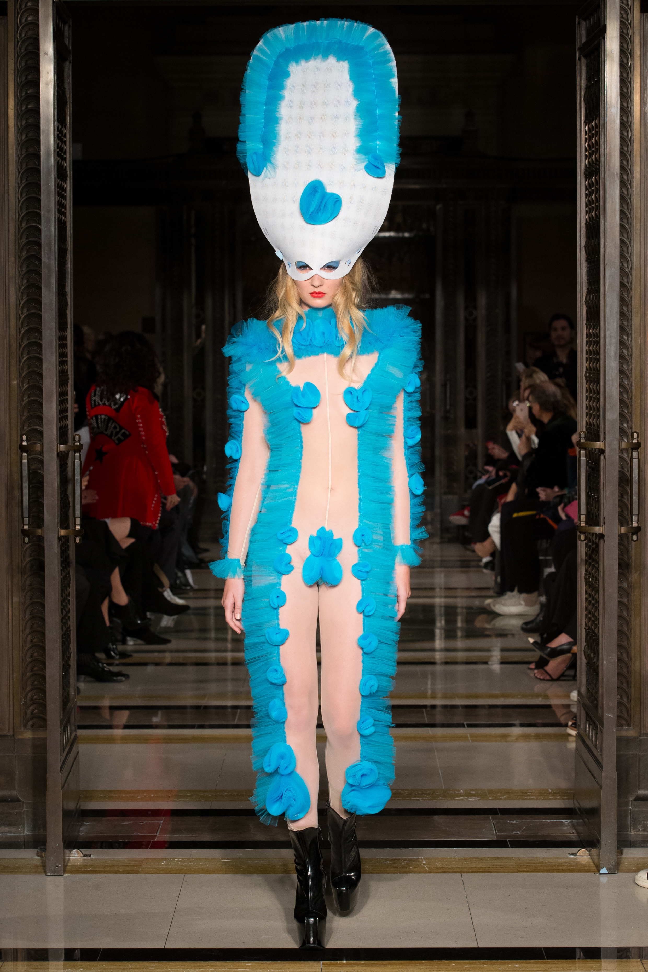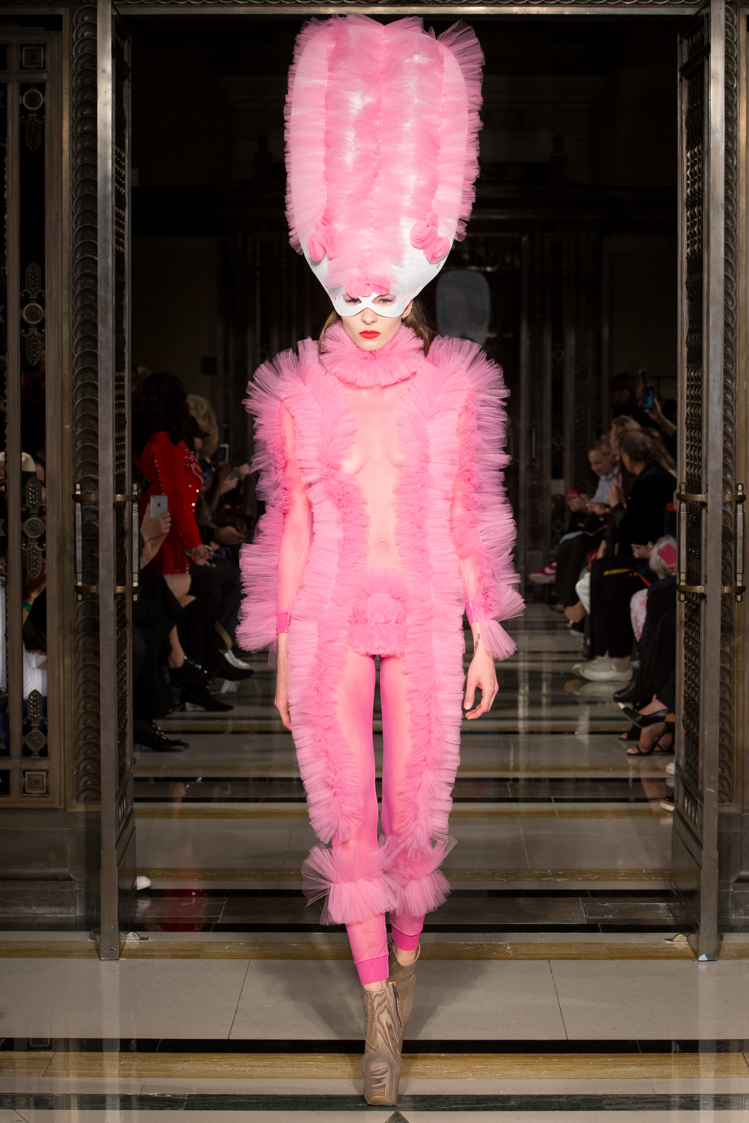 To end such an amazing collection came out two models in beautiful tall head piece masks, covered in frills and pom poms and similarly to the first model they wore a sheer body suit where pom poms and frills covered their bosoms and down there.