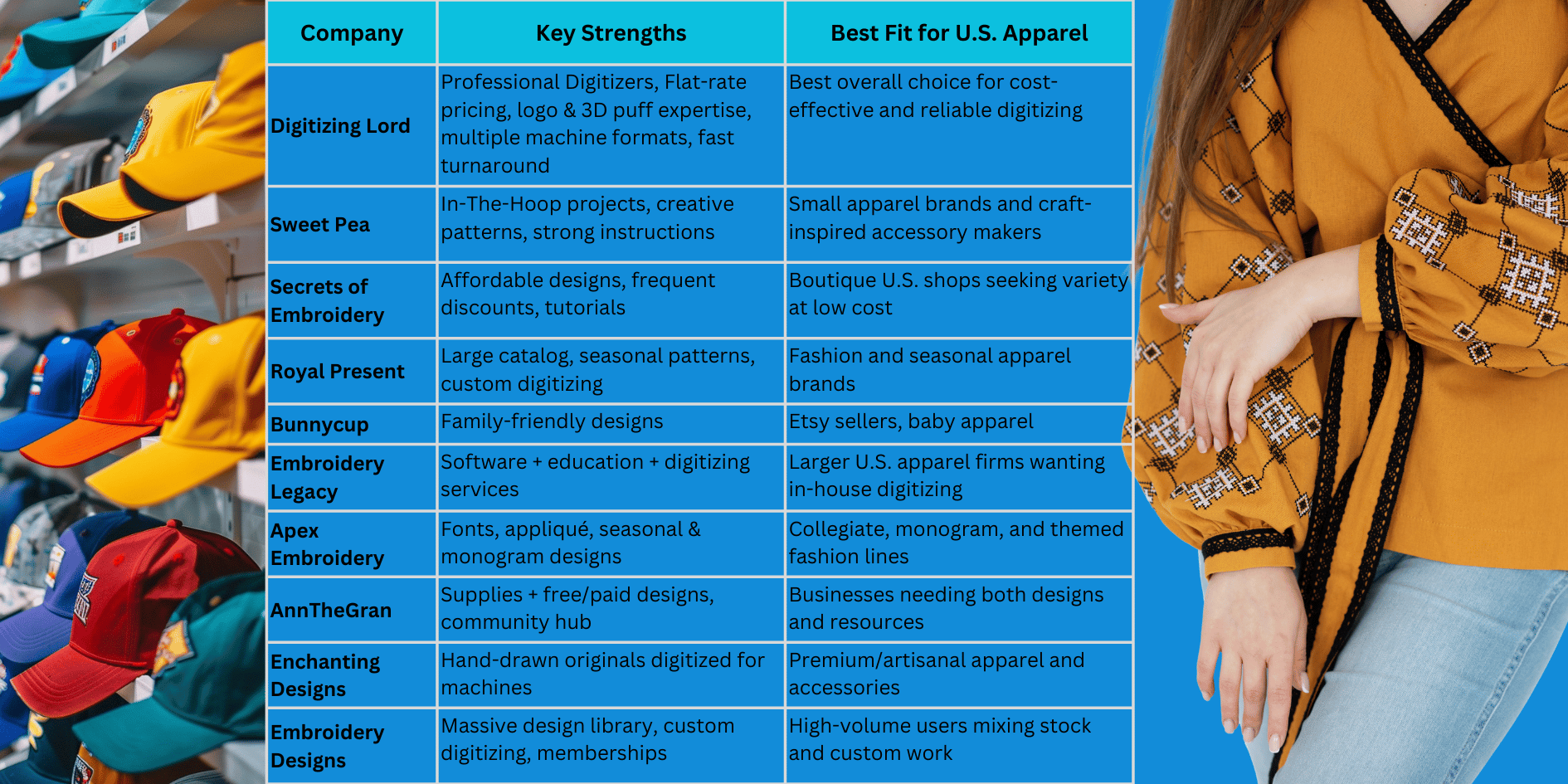 Comparison Table – Top 10 Embroidery Digitizing Firms for Apparel Business