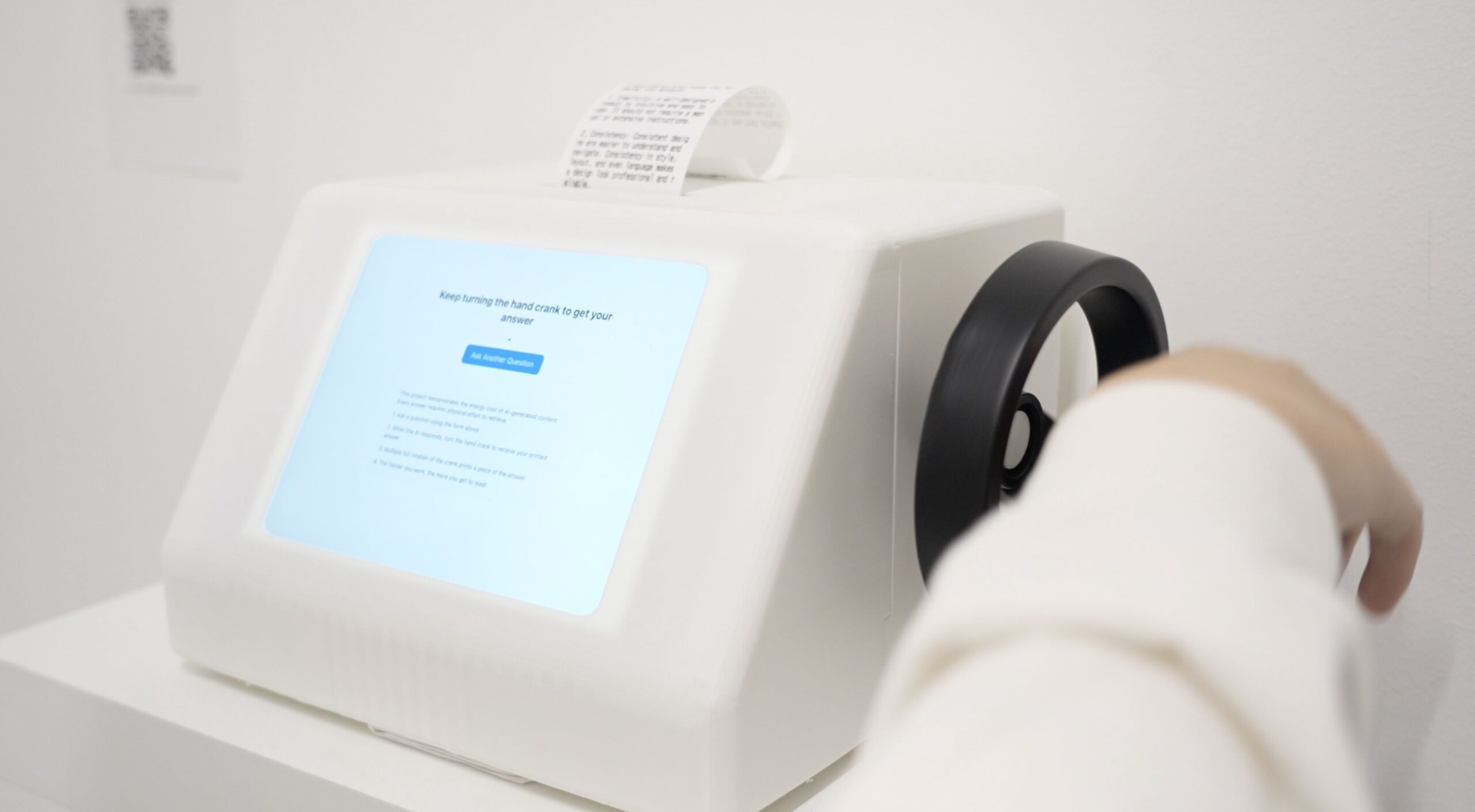 If The Book of Diaspora confronts erasure, Sweat for Generation confronts effort. Audiences turn a crank to generate power, only to discover that their exertion is converted into receipts: water consumed, electricity burned, carbon emitted. The installation literalizes the hidden labor of AI, rendering the “invisible” visible through the body.