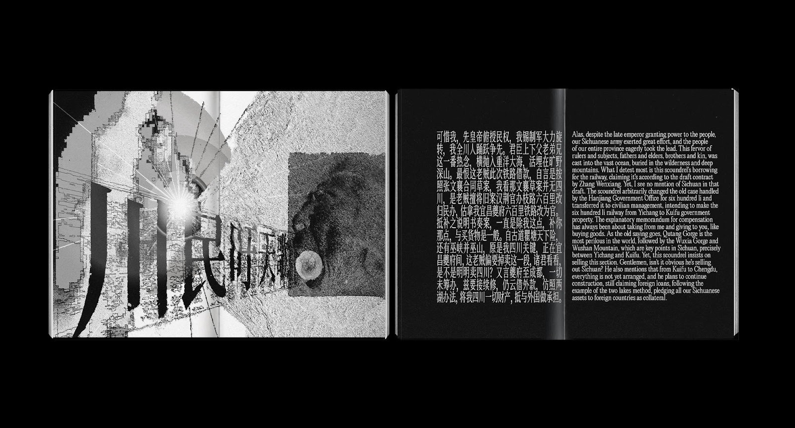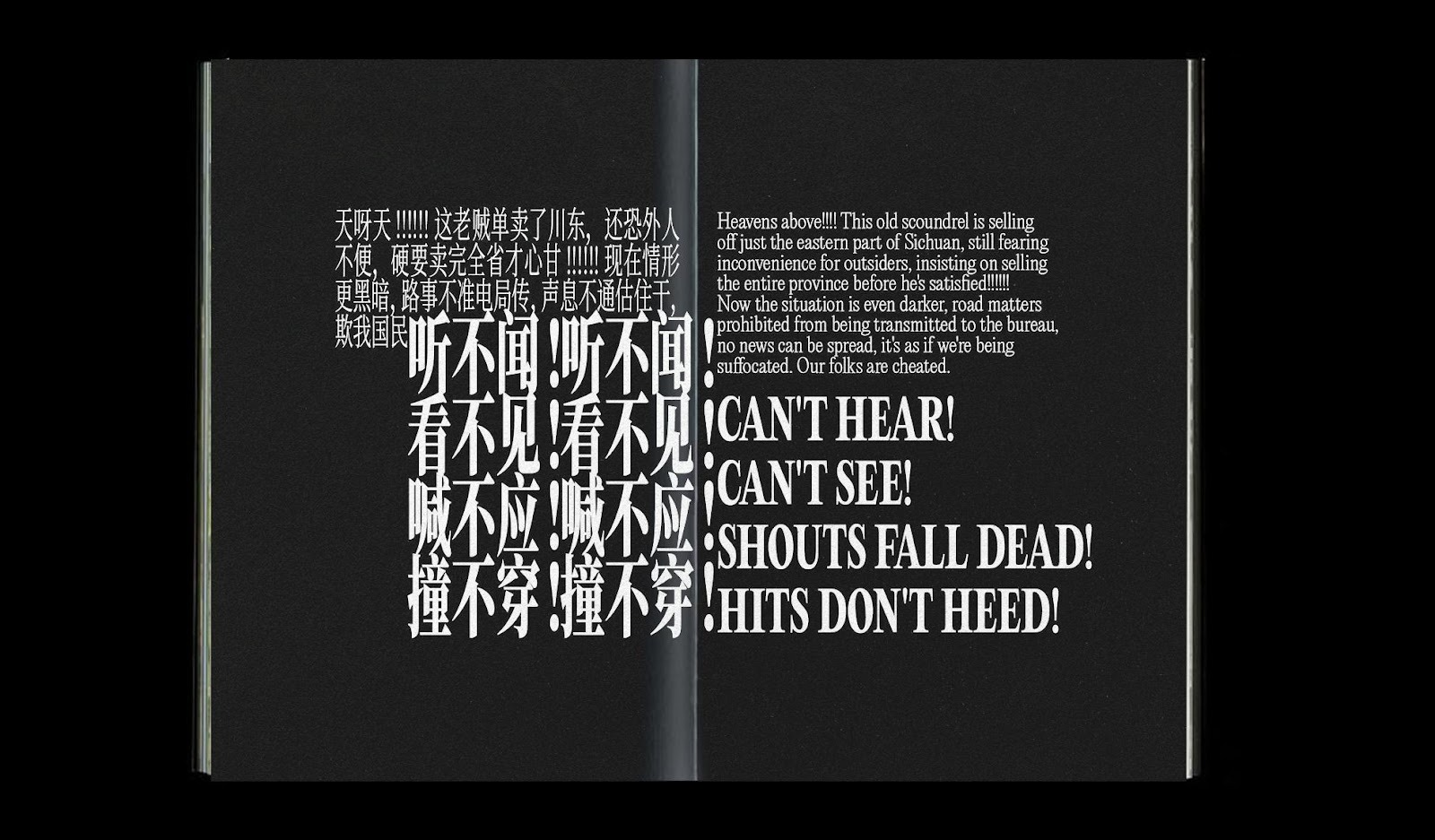 The design of Lines of Control embodies its subject’s tensions. Open the minimal cover, the full-bleed railway lines extend across pages with almost violent directness. Rigorous investigative text alternates with emotionally charged typographic moments—particularly Qian’s treatment of resistance documents like Sichuan People’s Cry to Heaven (川民吁天歌), where text arrangement becomes a tool for what she calls “conveying the story’s multiple rhythms.” The project builds on Qian’s broader practice, which includes highly selective international exhibitions at the Brooklyn Art Book Fair, Detroit Art Book Fair, Boston University’s Multiple Formats, and Pioneer Works’ Press Play, all of which are platforms known for showcasing leading voices in critical and experimental publishing. The approach echoes her earlier work, The Memeing of Political Discourse, a project recognized with prestigious KTK Design Awards, demonstrating a consistent methodology: using typography to decode how political power operates through both language and form.