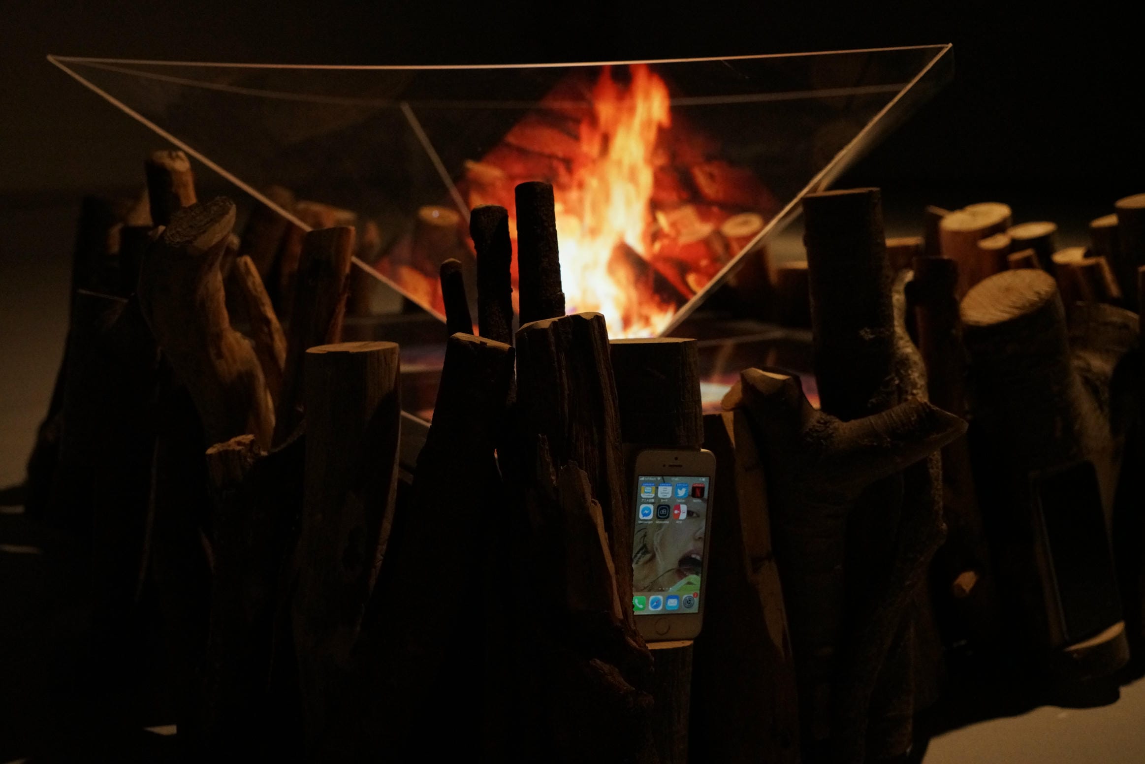 Similarly, the need to bring back a sense of presence is also evident in Taki-Bi (2018). Taki-Bi is an installation built upon the traditional ritual of sitting around a fire and sharing time together. Initially, the installation appears to be a communal object, inviting strangers to sit together without requiring any kind of negotiation. However, Tanahara implements a simple rule: if you want to charge your phone, you will need to place it on the charging device and leave the area until it is finished charging. That brief, forced pause when standing in a crowded space, phone-free, becomes the focal point of the installation. Strangers wander around each other awkwardly yet curiously, rediscovering the small social interactions we usually avoid by retreating into our screens.