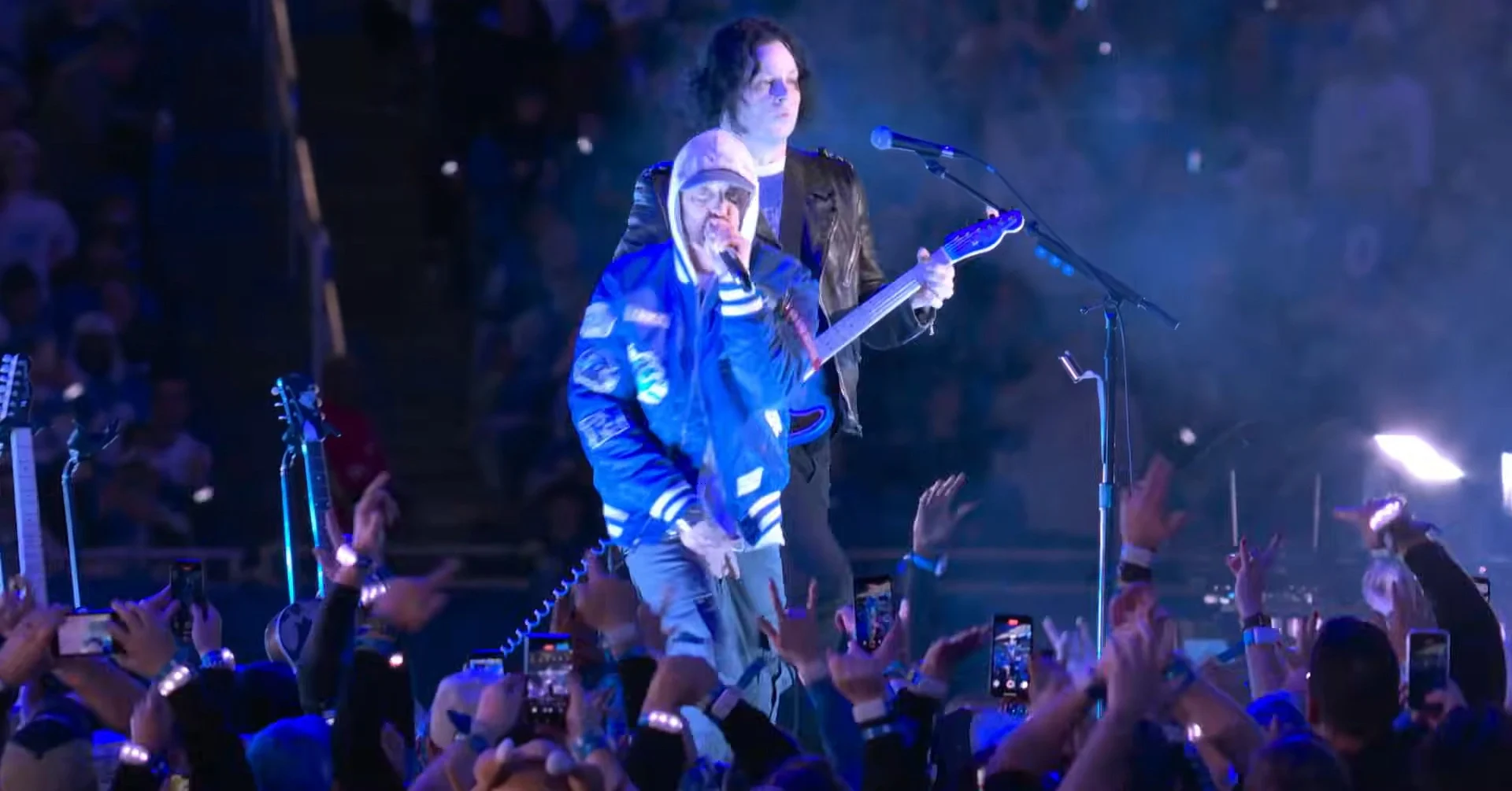 Jack White brought out Eminem during the NFL Thanksgiving halftime show at the Detroit Lions v Green Bay Packers game at Ford Field. White opened his hometown set with ‘That’s How I’m Feeling’ before bringing out fellow Detroit Rock and Roll Hall of Famer Eminem for a performance of ‘Till I Collapse. He carried on with ‘Seven Nation Army’, accompanied by the Detroit Lions’ Cheerleaders. Watch clips from it below.