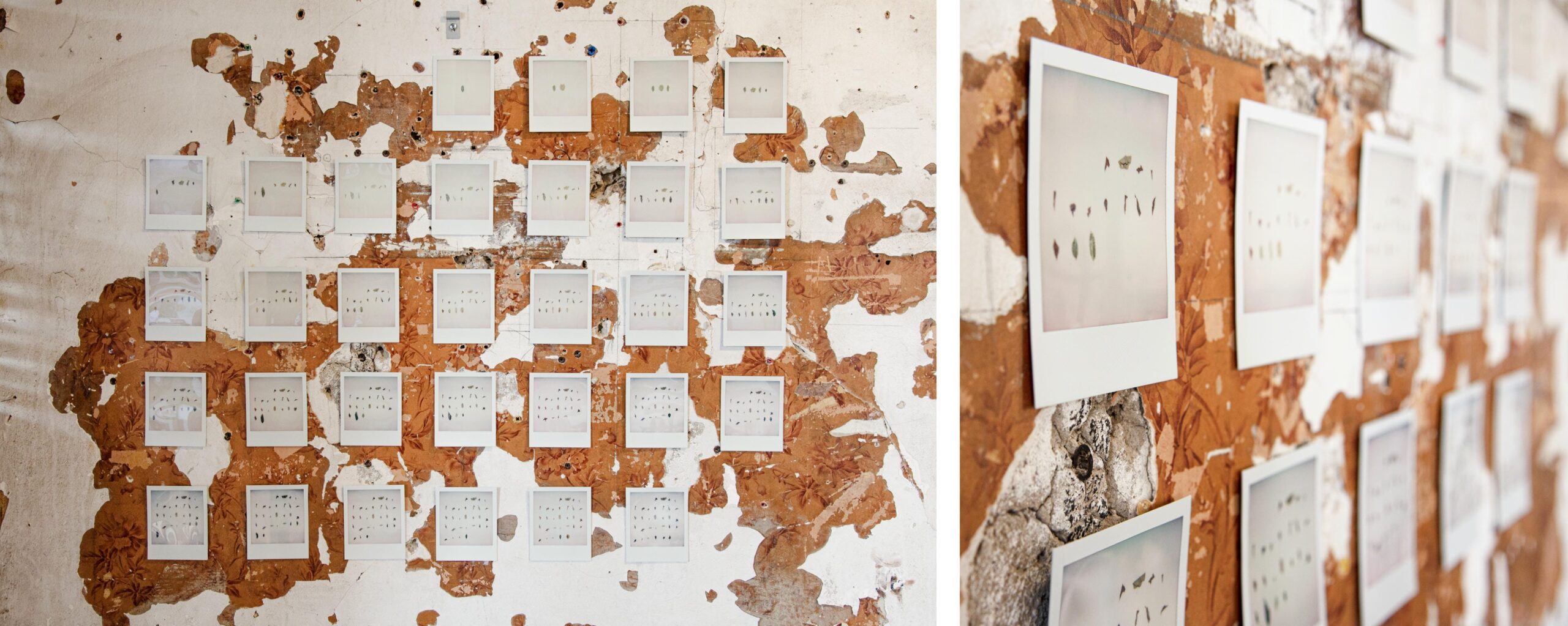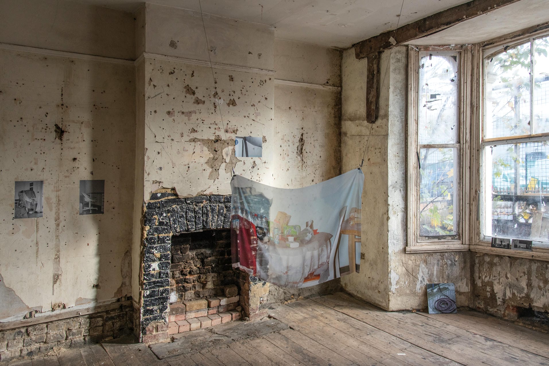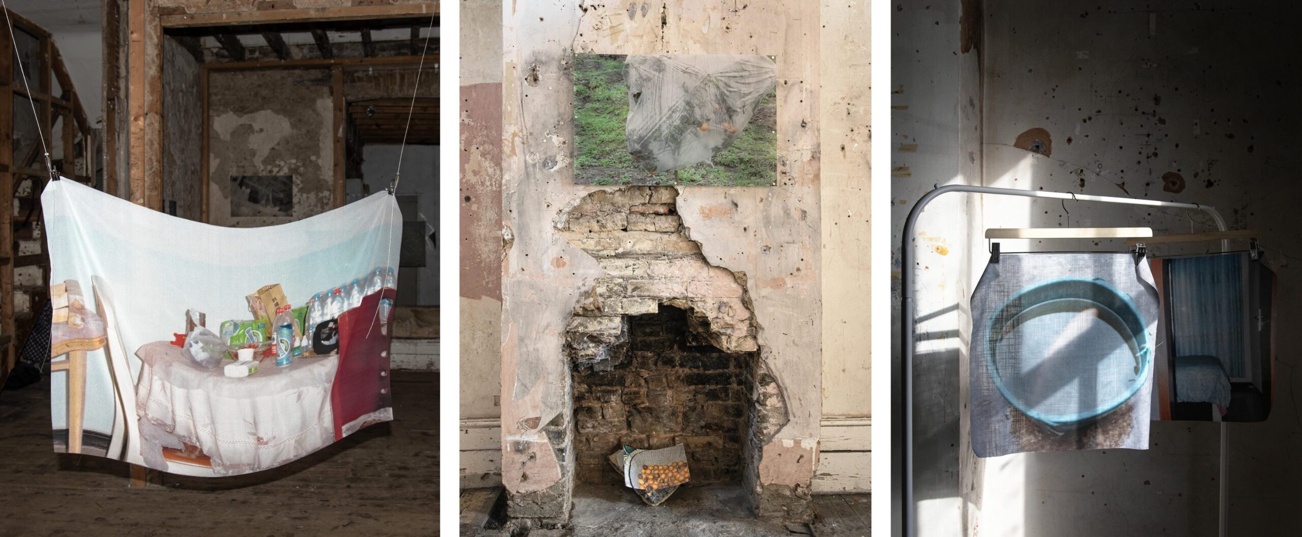 The fabric prints hang with a gentle downward drift, set in counterpoint to the hardness of the beams, creating a temporary, soft, and unstable structure, like a curtain raised and always ready to loosen again, allowing the shape of “home” to appear and fade with the movement of air. Broken bricks and branches sit quietly, paper surfaces gather slight creases as nails do not align, echoing the cracks of the room. The works settle into the fireplace, gather around raw holes in the wall, move across its fractures and along shifting lines of sight, allowing image and architecture to meet in the seams where “home” takes shape.