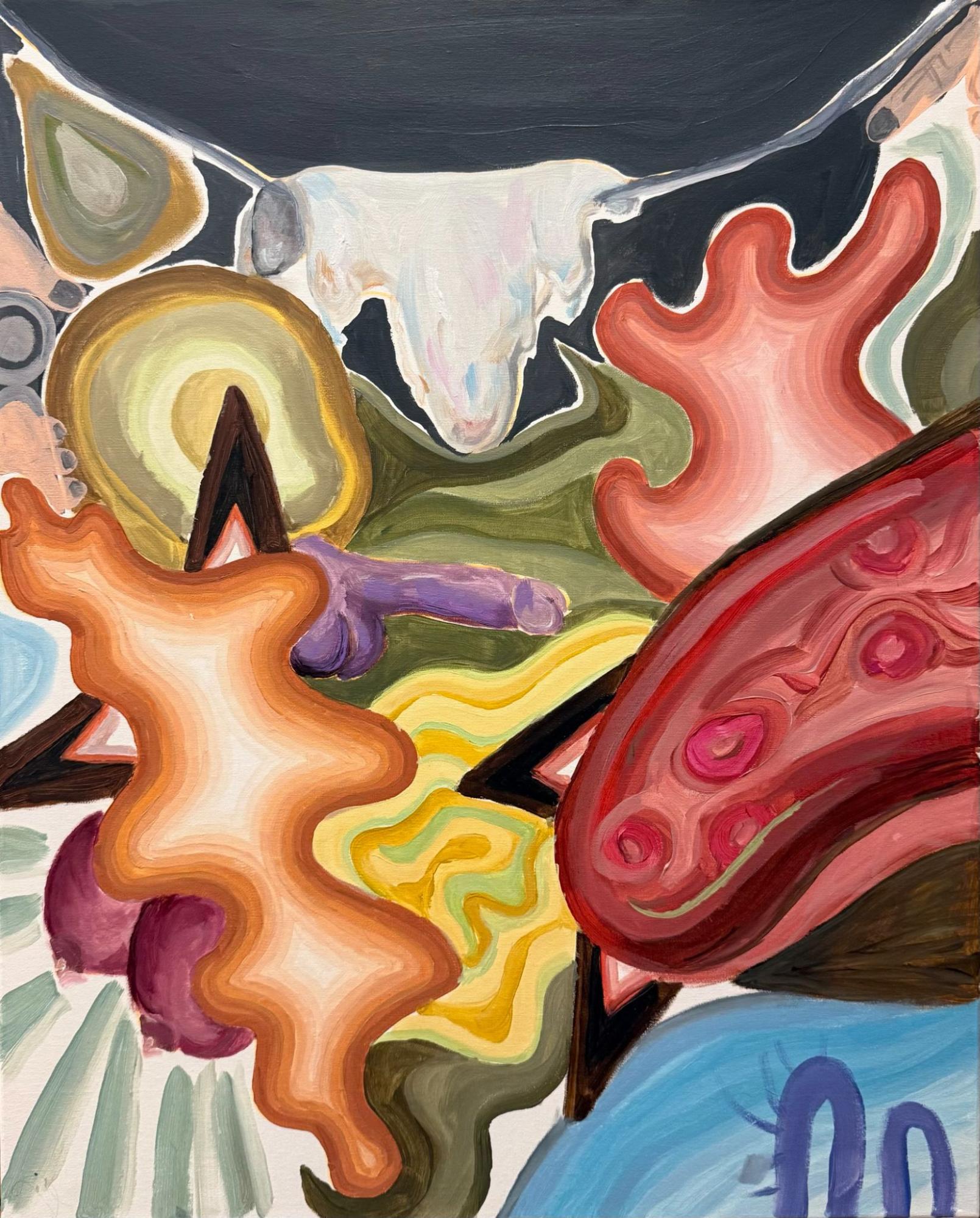 I see the latter in her work ‘Dopamine Rush’ where amorphous forms fill the canvas, were they once people, pieces of clothing or something more otherworldly? It reminds me of our addiction to smartphones that create surges of dopamine, which is the real-world realisation of the drug Soma from Aldous Huxley’s A Brave New World, where masses were controlled through hallucinogenic visions. We’re lost in a world of bright colours, in our always-online culture, but can we escape it and become more grounded? My viewing of her work teases at this critical contemporary issue.