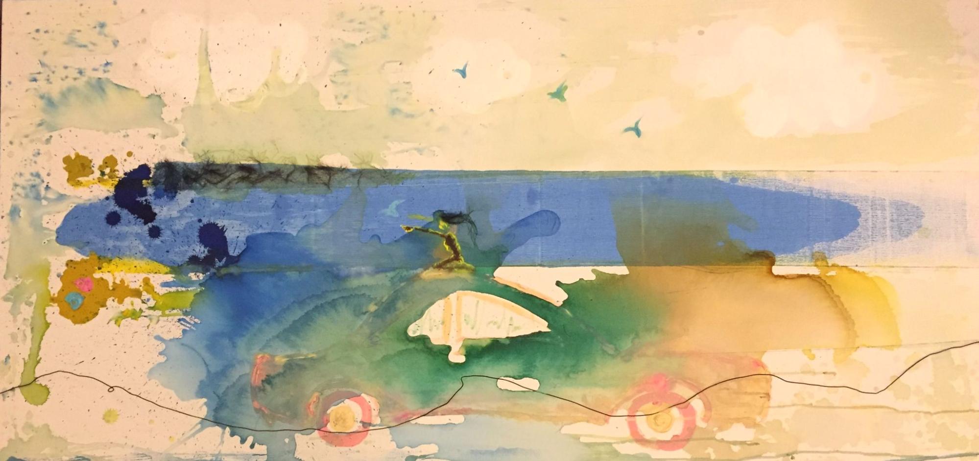 When I first look at Vidushi Gupta’s painting ‘The Tourist’, the colour and composition remind me of abstract expressionist painter Helen Frankenthaler. Yet when I look more closely, I see figurative elements, including birds and a person perched on a car, pointing in the opposite direction the car faces.