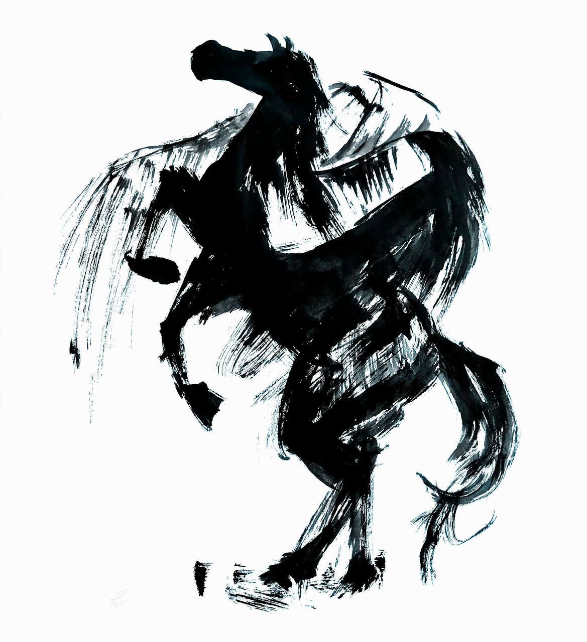 Storm Within turns the energy inside. The raising horse is not the symbol of power, but the response to the pressure that is building. The dry brushstroke breaks the body down into oscillating marks, implying volatility and discharge. The figure is clearly caught between falling apart and blowing its top.