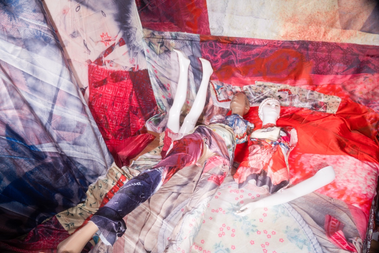 The installation combines flat textiles, fragmented mannequins, and enclosing structures, forming a provisional environment of remembrance. Rather than presenting a static memorial, the work functions as a spatial condition that viewers must physically enter. Movement through the space is constrained, producing a subtle sense of pressure and restraint.