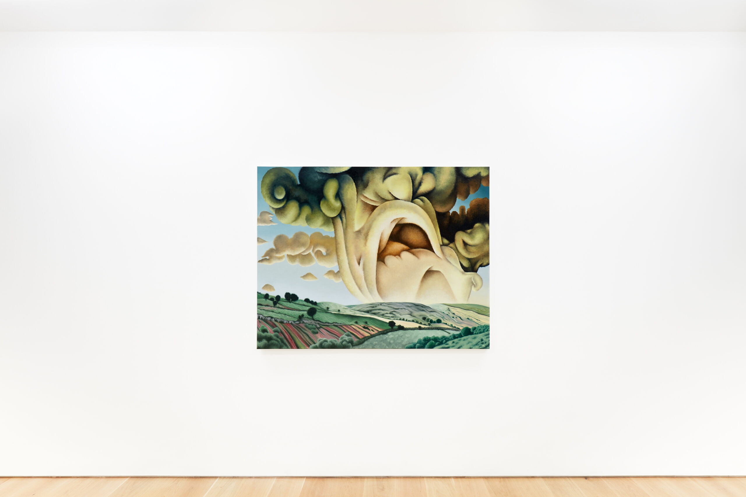 The Witch’s Garden was similarly motivated by an autobiographical starting point, tracking my experience of trying for and later having children. It was through researching the origins of the love heart symbol that I came across the history (likely fake news) about a now-extinct plant called silphium, which was apparently an aphrodisiac and contraceptive and was said to have a heart-shaped seed. That set me off into researching plants and their histories, which are of course inextricably entangled with our own. Contextually, the research was so rich and fascinating that I couldn’t stop making the paintings – there are about 60 works in the series. These plants and flowers I was painting became containers for emotion, story and history, but I also always saw them anthropomorphically – as characters in their own right. For Weird Weather that gaze has shifted outward toward landscape – there has been a kind of zooming out.