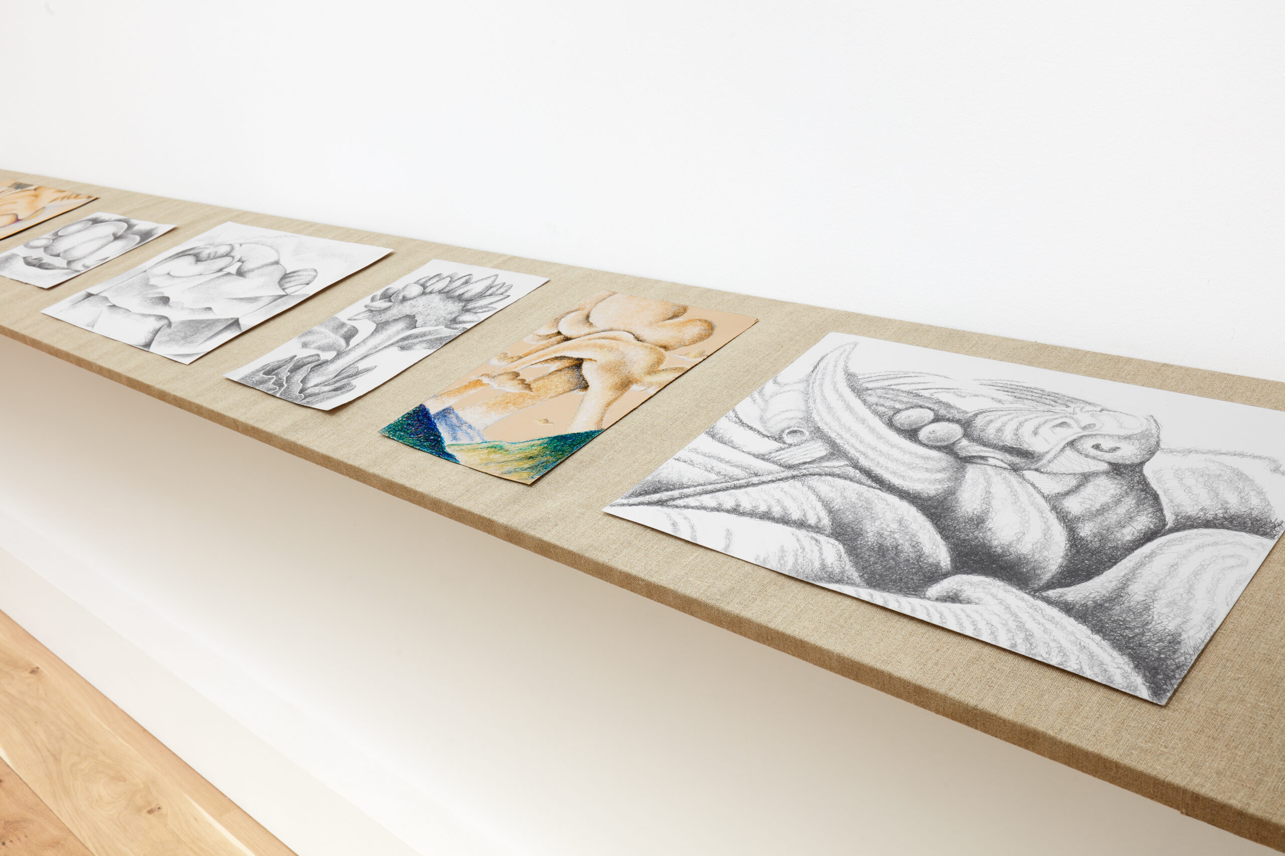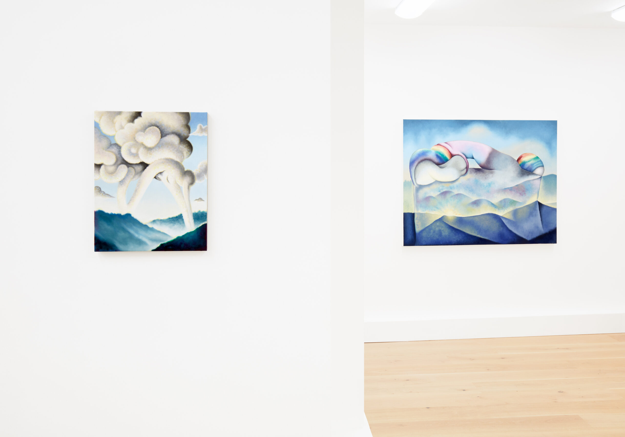 The paintings all start with drawings, but before committing to making the paintings I allowed the drawing stage to be very open – many of them took me in unexpected directions. The logic of the works was shaped in part by my connection to landscape and home. The paintings reference the hills of the Pennines where I grew up. Rather than depicting the landscapes literally, I allowed internal and external states to fold into one another, attempting to push bodily sensation through weather and geography.
