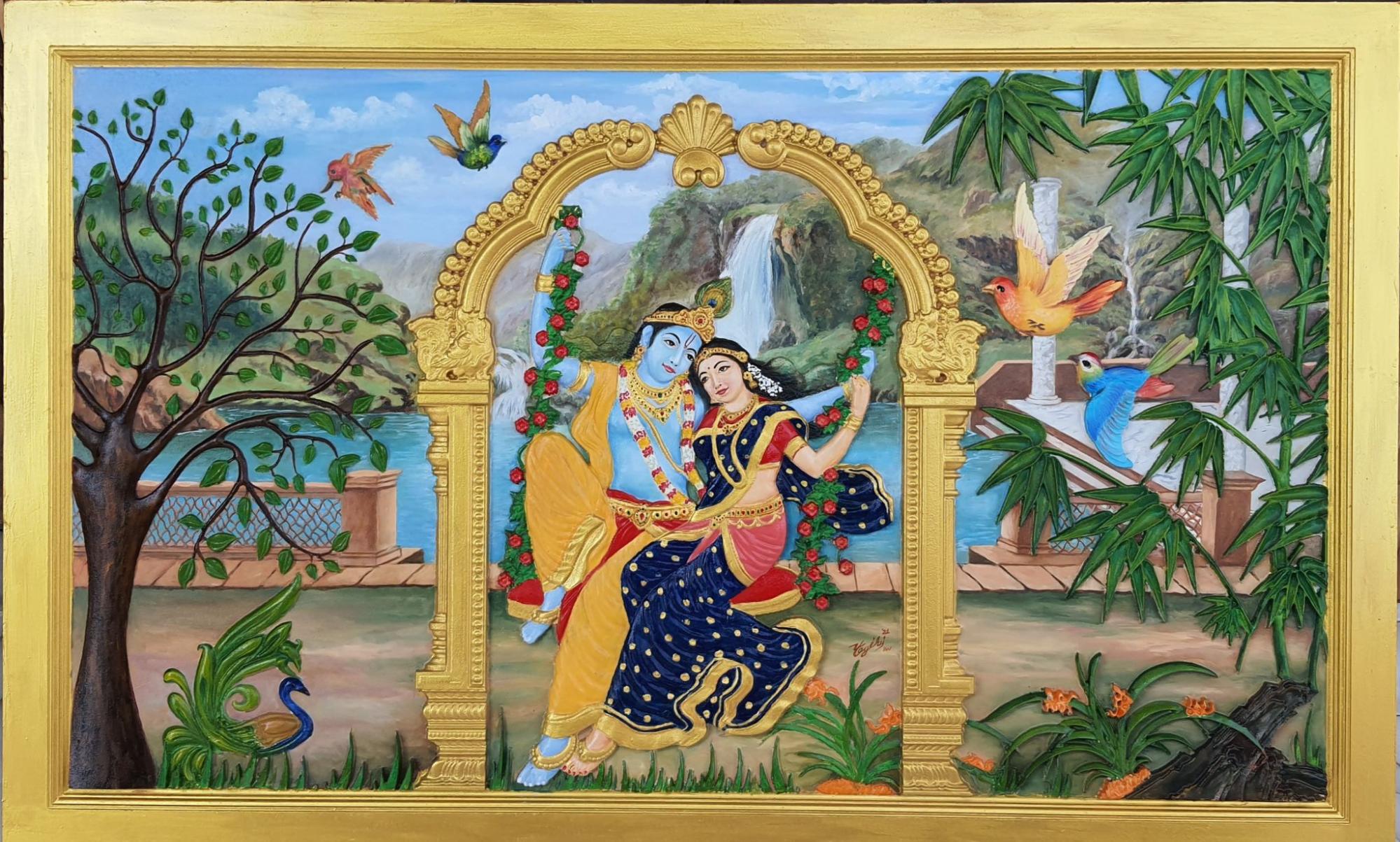The artist also demonstrates technical skill in painting in relief, as seen in his depiction of Radha and Krishna, the great love story at the centre of Hinduism.