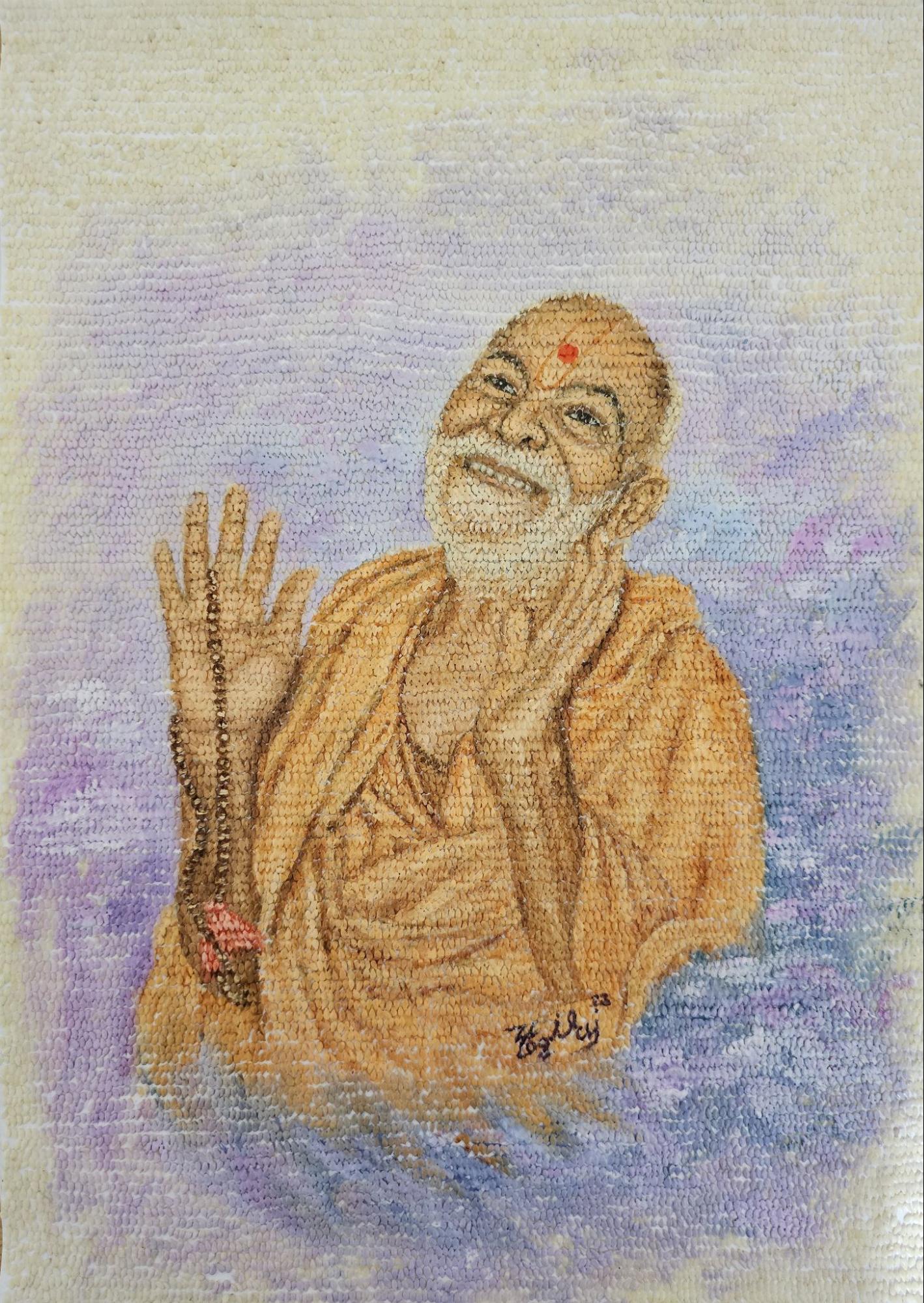 His ambition is evident in his portrait of Yogiji Maharaj, in which individual sesame seeds were painstakingly affixed to the surface to create a richly textured work. It makes you want to run your fingers across the surface, the way we feel when we look at the impasto painting of the likes of Vincent Van Gogh or Frank Auerbach. The sesame seeds also hold significance in Hinduism, symbolising immortality, purification, and ancestral connection. Displayed at the BAPS Shri Swaminarayan Mandir in Neasden, North London, it demonstrated both his commitments to creating unique artworks and imbuing them with spiritual reverence.