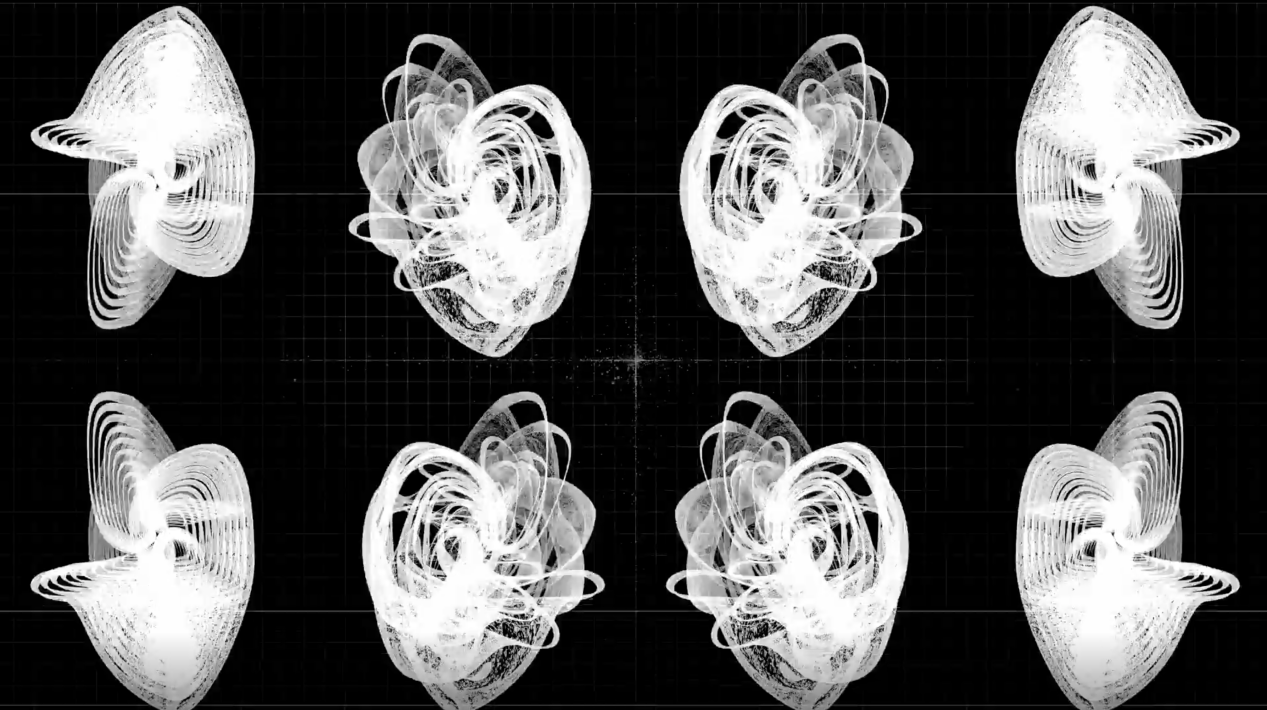 Through multi-channel projection and an immersive soundscape, the work encourages viewers to encounter frequency as both a visual and auditory experience. Frequential constellations explode, multiply and mutate from a progenitive axis; kinetic energy mapped in sgraffito-like gestures across space and time. Cybernetic warbling and pulsations glitch against a vast, ambient soundscape, and despite the unpredictability of it all, it feels rather hypnotic. In fact, once our eyes and ears have adjusted, it’s as though we’re now in full possession of the faculties for seeing in the dark.