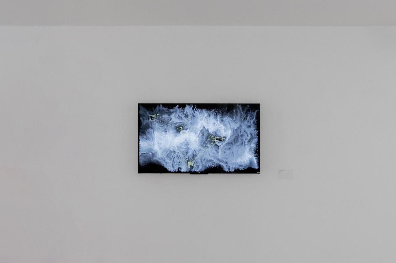 For Liao, the universe is an immense information structure, every event or disturbance of a node within its reticulate network. In her most recent moving-image piece, Frequency Fields (2025), she translates the shifting frequencies and segmentations of network data packets and sound waves into a dynamic visual field. Using point-cloud formations, flowing particle systems, and variations in light and colour density, the piece transforms the flotsam and jetsam of frequency data into perceptible patterns that ripple and evolve in real time.