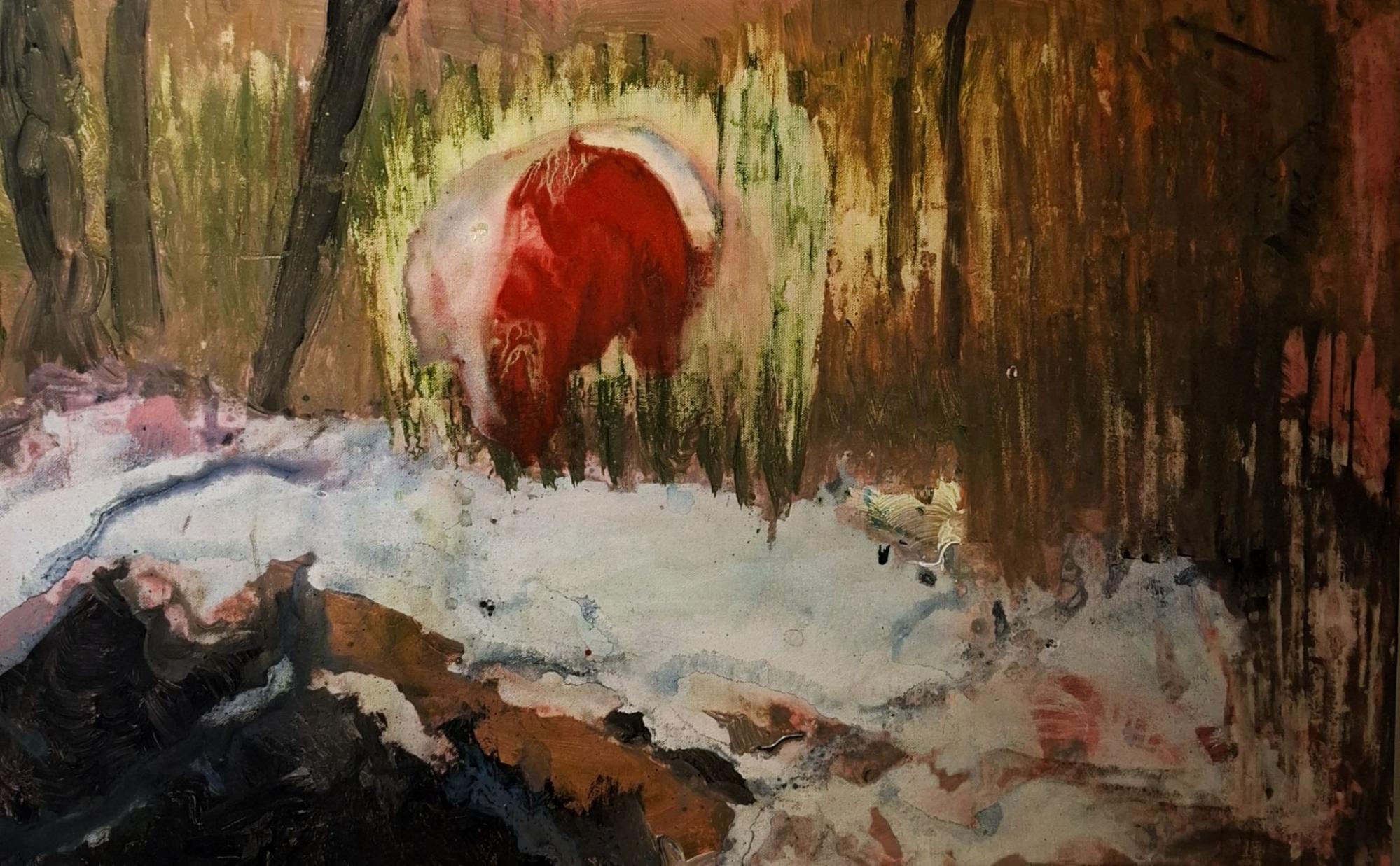 We may be in a gallery space in Acton, West London, but lose ourselves in Harrison’s paintings and we’re transported from rainy London to the verdant Black Forest. A hazy figure can be seen in the landscape; ballet dancers with a lit-up house in the background feel surreal, and what looks like a creature covered in blood heightens the intimidation factor.