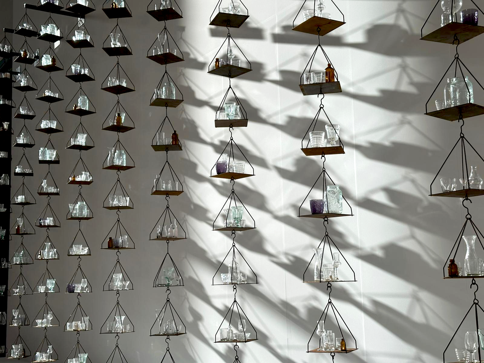Originally conceived for the cloister of the Monastery of San Lazzaro degli Armeni in Venice, Senza titolo is a large-scale installation made up of vertically suspended weighing scales holding delicate groupings of Venetian glassware. The scale, a recurring element in Kounellis’ practice since the late 1960s, operates here as both object and metaphor, pointing to systems of trade, movement and cultural exchange across the Mediterranean. Arranged in a mobile-like formation, the work subverts the scale’s conventional function, privileging instability over precision. Rather than advancing a fixed narrative, the installation stages a field of associations in which historical reference symbolic meaning are deliberately unresolved.