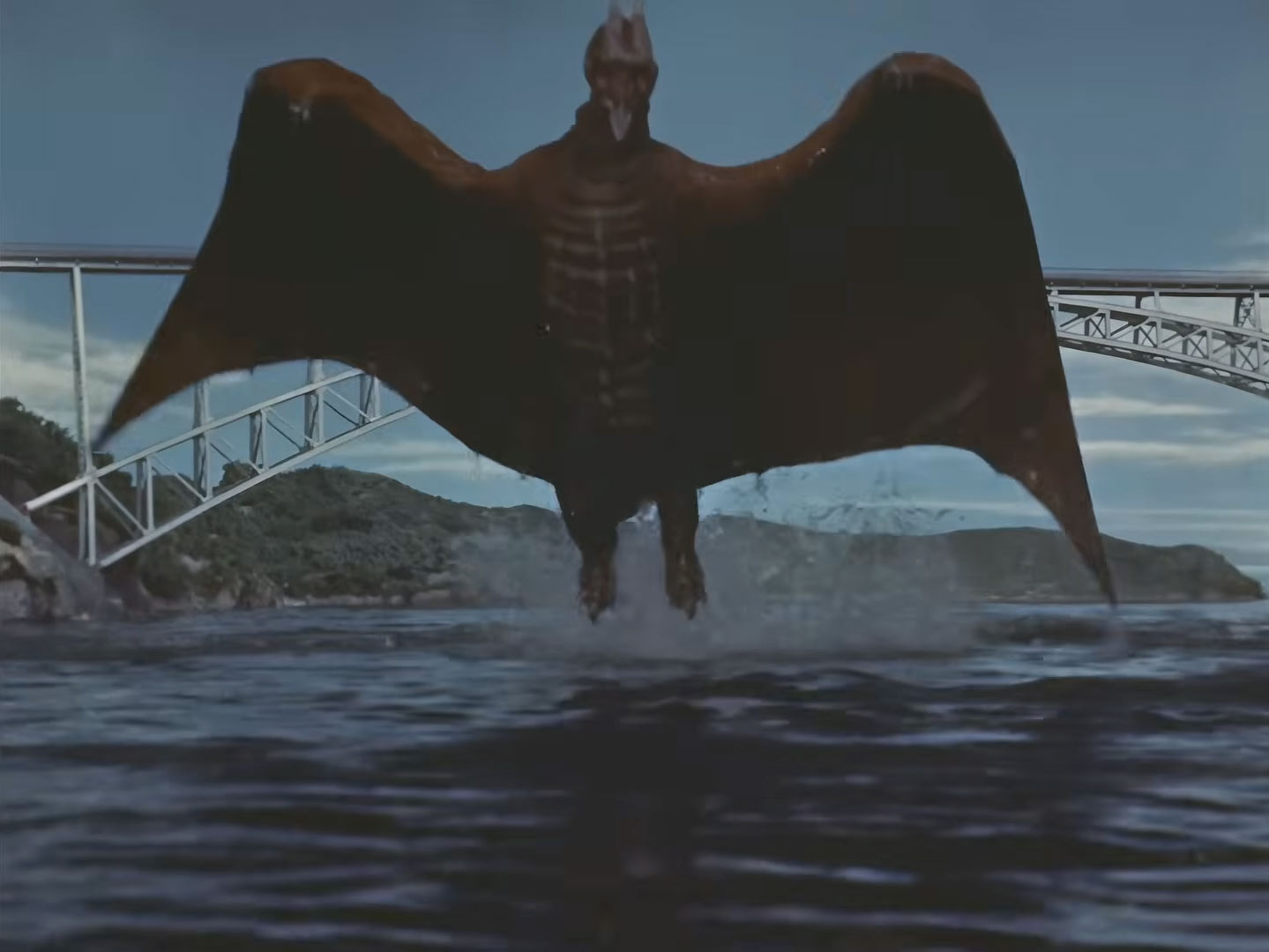 Approximately 60% of Rodan’s budget* went toward the special effects, which were lensed for the most part during overnight summer shoots. (Working nocturnally allowed the crew to escape seasonal heat that would’ve compounded the temperature generated by studio lights.)49 Rodan—depicted as a pterosaur rather than the feathered dinosaur that begat the concept—was realized via numerous props and marionettes, though certain scenes required a costume worn by stuntman Haruo Nakajima. Nakajima had played Godzilla in both of its appearances thus far and, like on those shoots, would be put through perilous situations. One scene called for Rodan, having been downed in the Hario Strait, to launch from the water and destroy Japan’s recently built Saikai Bridge. Nakajima donned the costume and was carried over the miniature set by piano wires—when the pulley suspending him suddenly broke! Still clad in the suit, he plummeted into the strait and was fortunately spared injury thanks to the water and the suit’s huge, spacious wings, which absorbed most of the impact.50
