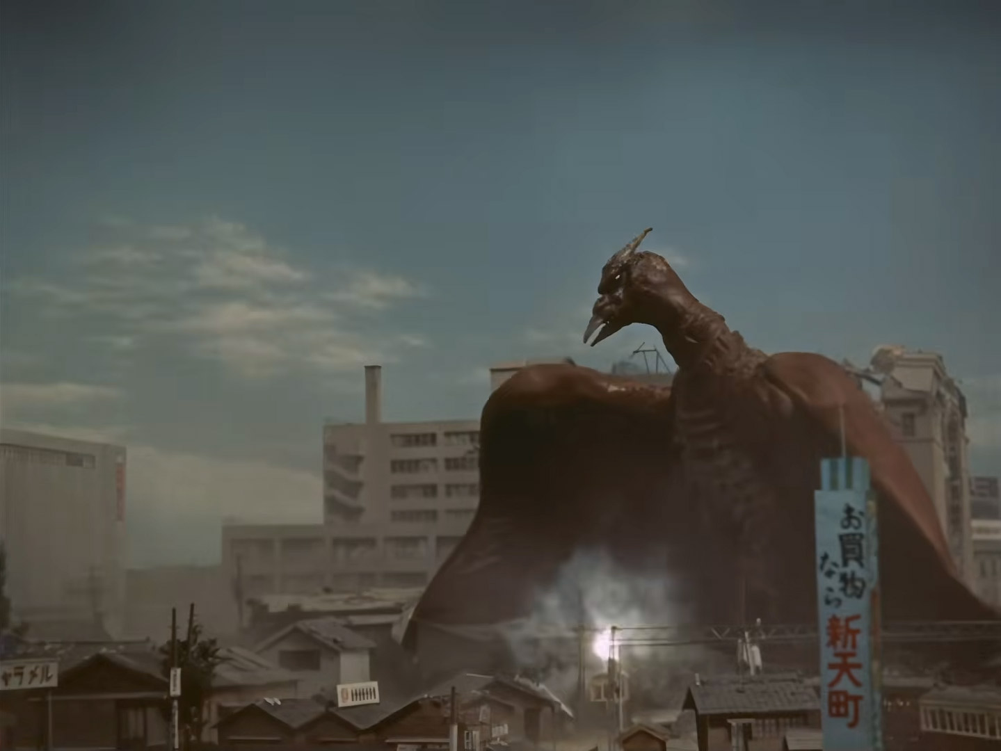 Godzilla Raids Again wasn’t well-regarded within studio walls; special effects cameraman Sadamasa Arikawa felt “[s]omething was missing” and recalled fellow staffers “talking about the first movie” at a company preview.5 Nevertheless, it proved a worthy financial successor, becoming the year’s fourth biggest Toho release6 with an attendance of 8.34 million.7 And while box office stats for Half Human remain seemingly unavailable, Toho recognized there was still a market for Japanese monsters—especially when Godzilla migrated to the United States in the form of a 1956 re-edit called Godzilla, King of the Monsters! and grossed over $700,000.8 The year that Americans were being introduced to Godzilla, the studio unleashed—in Anderson and Richie’s words—“another prehistoric monster” via Honda’s Rodan and this time presented urban destruction in color.9