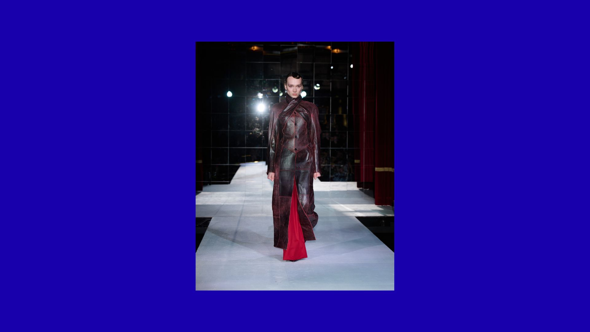 The collection felt like a sharp, modern rewrite of Dietrich’s wardrobe, everything she wore, and eventually turned into her signature. Strong tailoring, power suits, structured blazers, floor-sweeping coats, and of course, the Marlene pants, made famous back in the 1930s for their high waist, wide leg, flowing fabrics, and basically being her second skin. Ties had bigger ambitions and returned as tops. Boxy jackets arrived drenched in abstract knitting. Drapes spilled from leather vests all the way down to the toes. Collars, built from two crossed panels, melted into the waistline. Red, blue, and green flashed through a disciplined palette of black, brown, gray, and white. Tanned leather, strict denim, heavy wool, and soft lace. A very good-looking power play, actually. And let’s not forget, Haderlump only flirts with deadstock fabrics. Turns out, fewer options just meant better choices. Whether Ehrhardt’s method is easier is up for debate, but it’s definitely sharper.