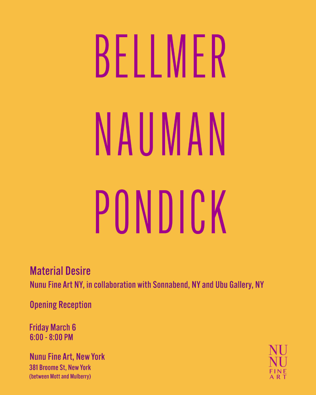 Nunu Fine Art in New York will present Bellmer Nauman Pondick: Material Desire from 6 March to 30 May 2026. Organised in collaboration with Sonnabend and Ubu Gallery, the exhibition brings together works by Hans Bellmer, Bruce Nauman and Rona Pondick, tracing a cross-generational dialogue around the body as subject and material.