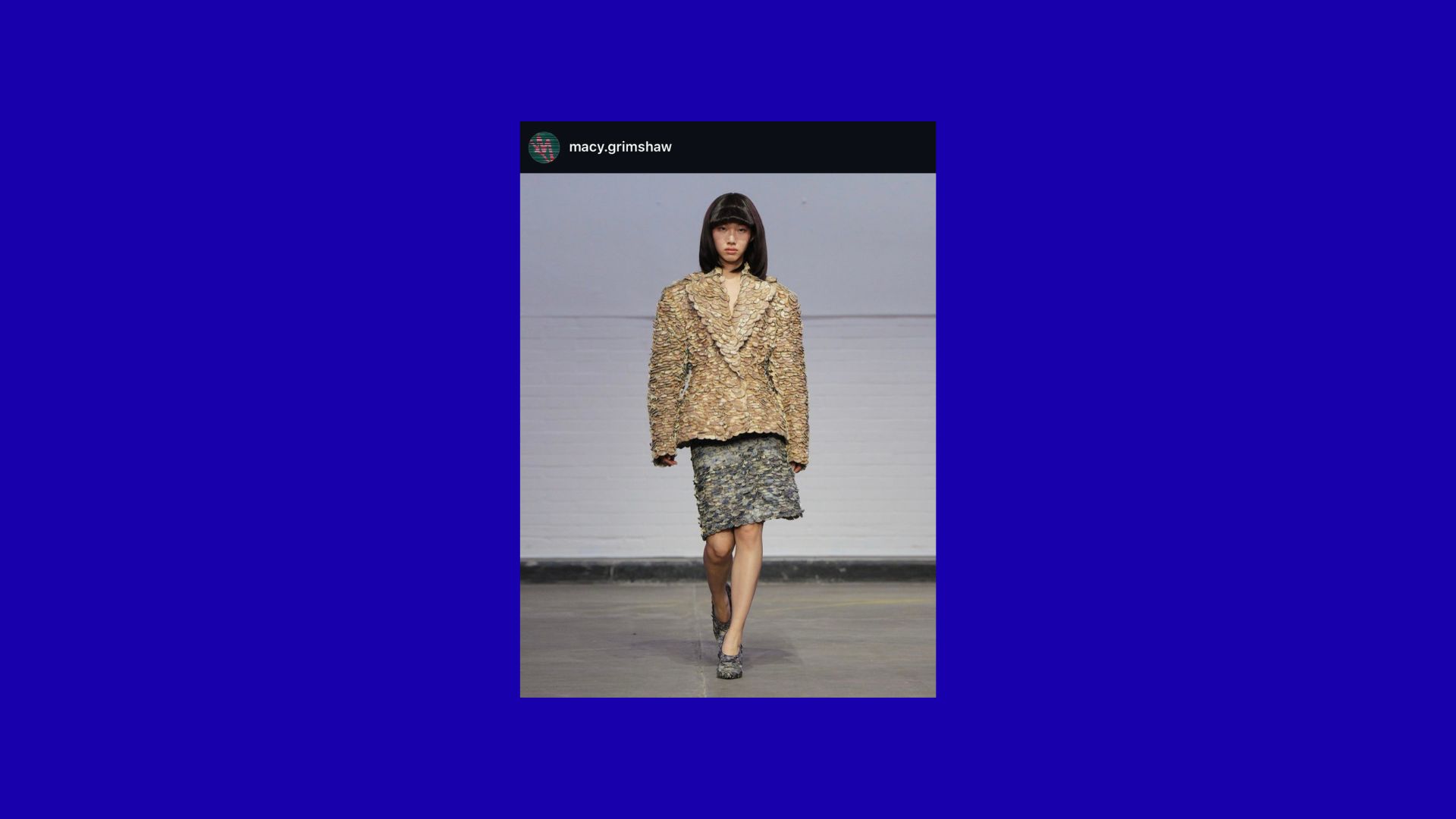 Days later, I’m still haunted by one emerging designer, Macy Grimshaw. But years before her work haunted me, it had already won over Harry Lambert, and he was backing her again. The stylist jumped in to assist a collection of 9 looks, my favorite being the “Blown-Away” dress. Denim and paper on grid-cut leather that feels like a gate left to rot, which looked like a canvas had floated down and landed on it.