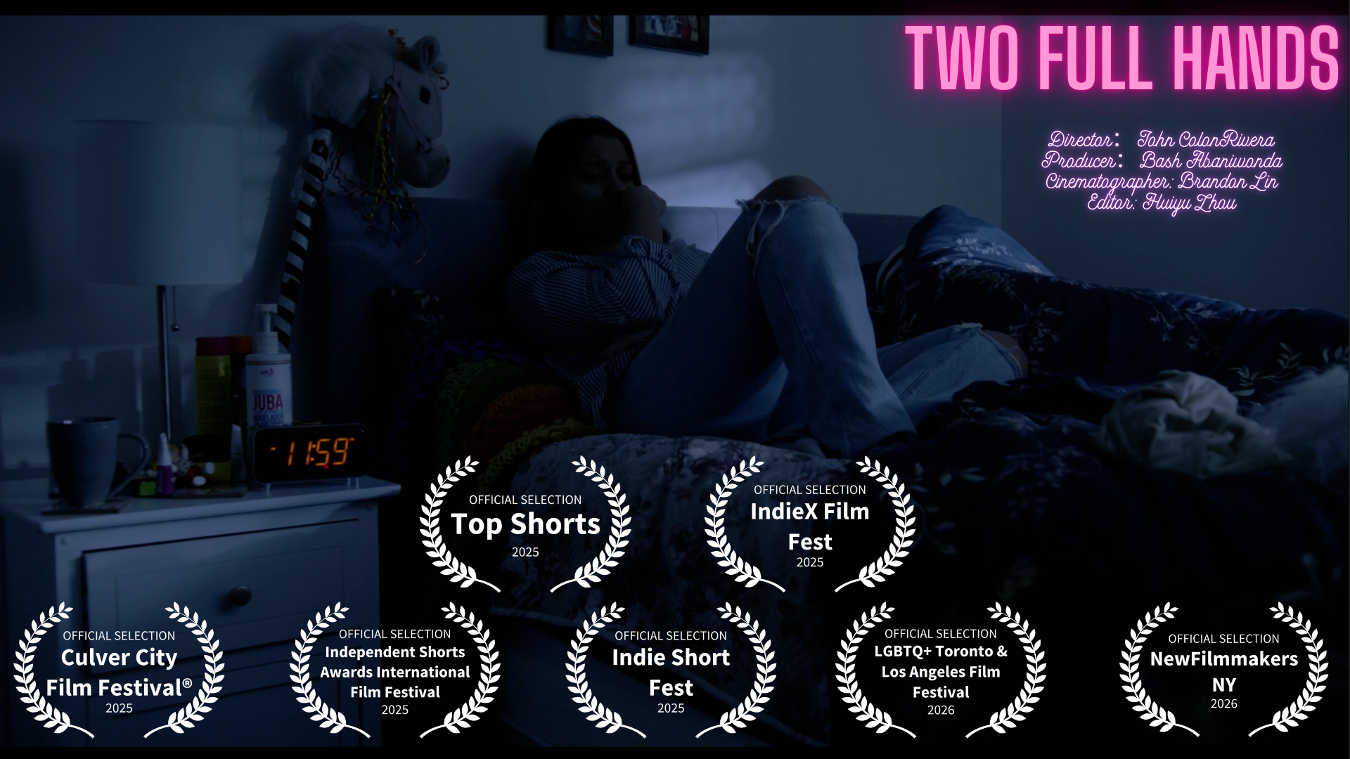 The film’s intimate scale keeps it close to the dimensions of ordinary experience and preserves the emotional proximity of its subject. Nothing in Two Full Hands pushes its world beyond the human scale of the story it tells. The short has also found recognition on the festival circuit, including an award at Top Shorts, official selection by the Culver City Film Festival, and a semi-finalist placement at IndieX Film Fest. That recognition carries particular weight in the case of Top Shorts and IndieX. Widely regarded as a leading online short film festival, Top Shorts has earned strong recognition for its visibility and critical reception within the short film community. IndieX, based in Los Angeles, its past honorees have included Academy Award winners, Oscar nominees, Emmy winners, and Sundance-recognized filmmakers. Seen in that context, the film’s festival recognition suggests that its emotional and thematic concerns have resonated beyond its immediate production context.