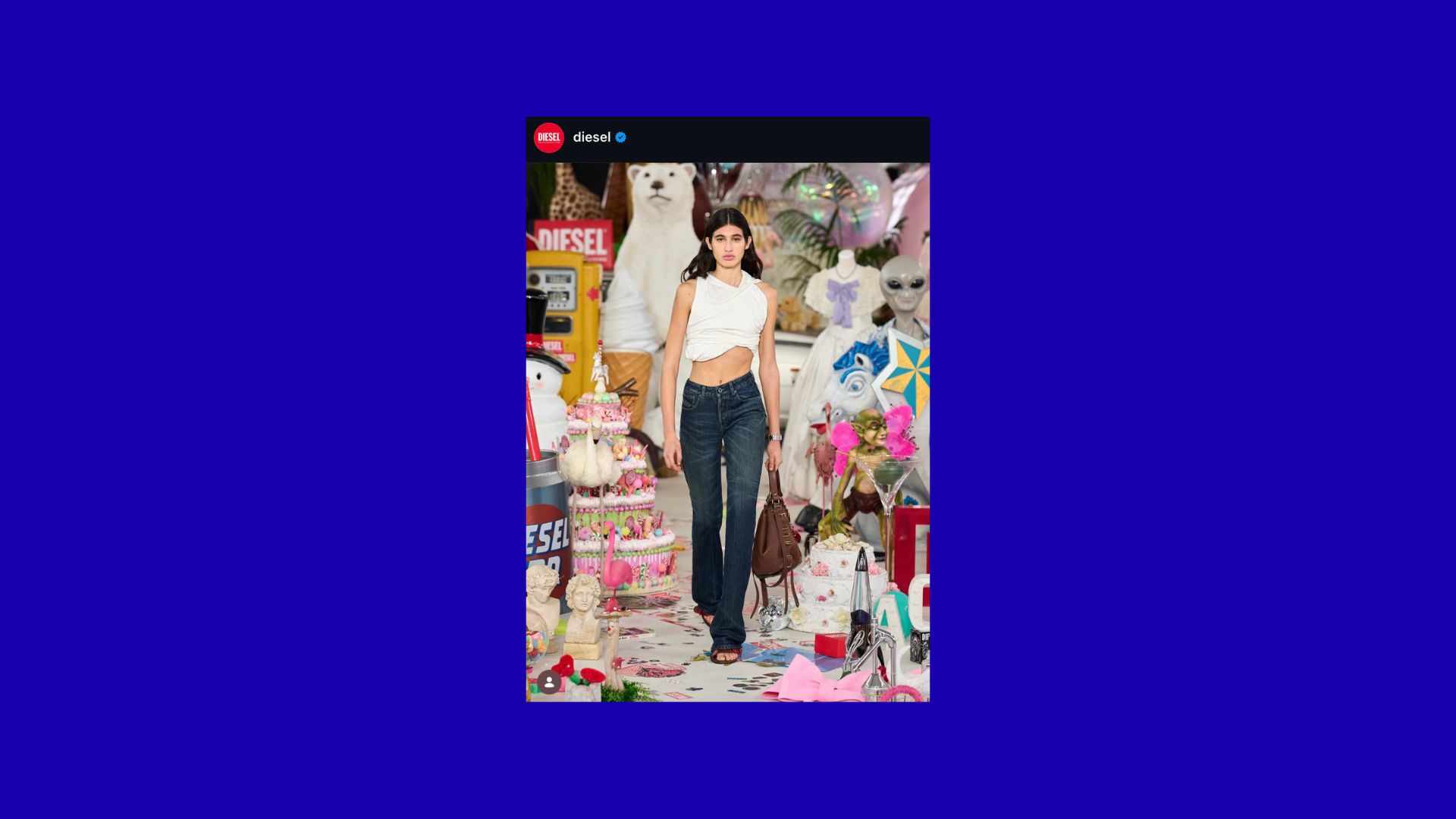 I don’t think anyone who spent their Tuesday afternoon navigating CNMI’s Fashion Hub on Milan’s Via Moncucco 35 expected to walk into what looked like a very funky ragpicker’s yard. In reality, it was a massive immersive installation of repurposed items. Picture a motorcycle next to a nutcracker statue, in front of a Renaissance dress, a colorful umbrella behind it with a unicorn underneath, a giant wedding cake nearby, and an actual car just a few steps ahead, surrounded by clowns, rocking horses, and martini glasses. I felt mildly threatened by an alarmingly huge chicken, though little pink flamingos sprinkled around somehow made it all okay. The entire spectacle was Diesel memorabilia dating back to 1978, which fits perfectly with the brand’s love affair with upcycling, Successful Living, and Glenn Martens’ idea of a collection about waking up in a stranger’s living room.