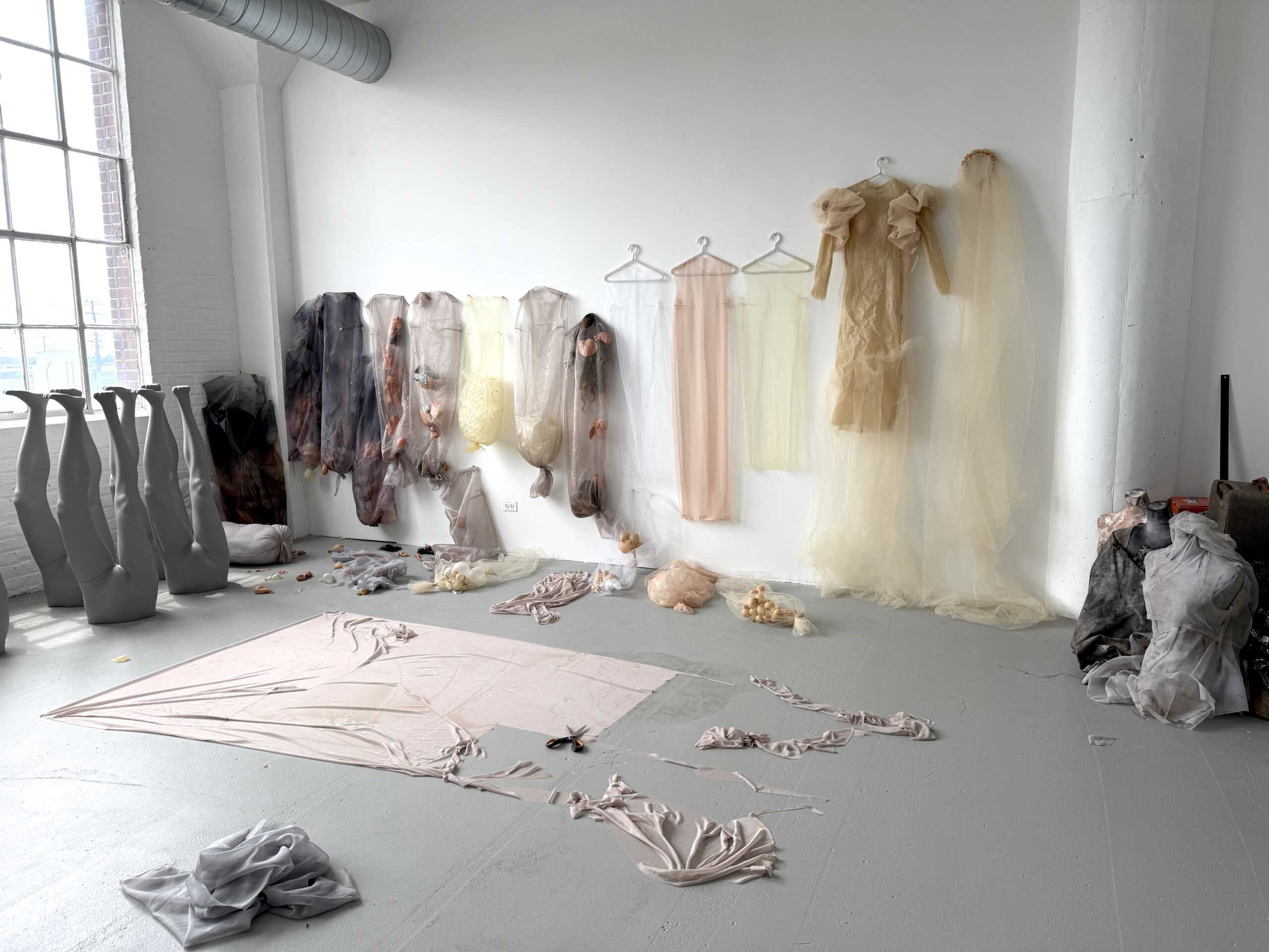 In my sculptures, garments become stand-ins for the body itself. I stretch them, pin them, harden them, or let them collapse. They carry the memory of being worn and the pressure that comes with it.