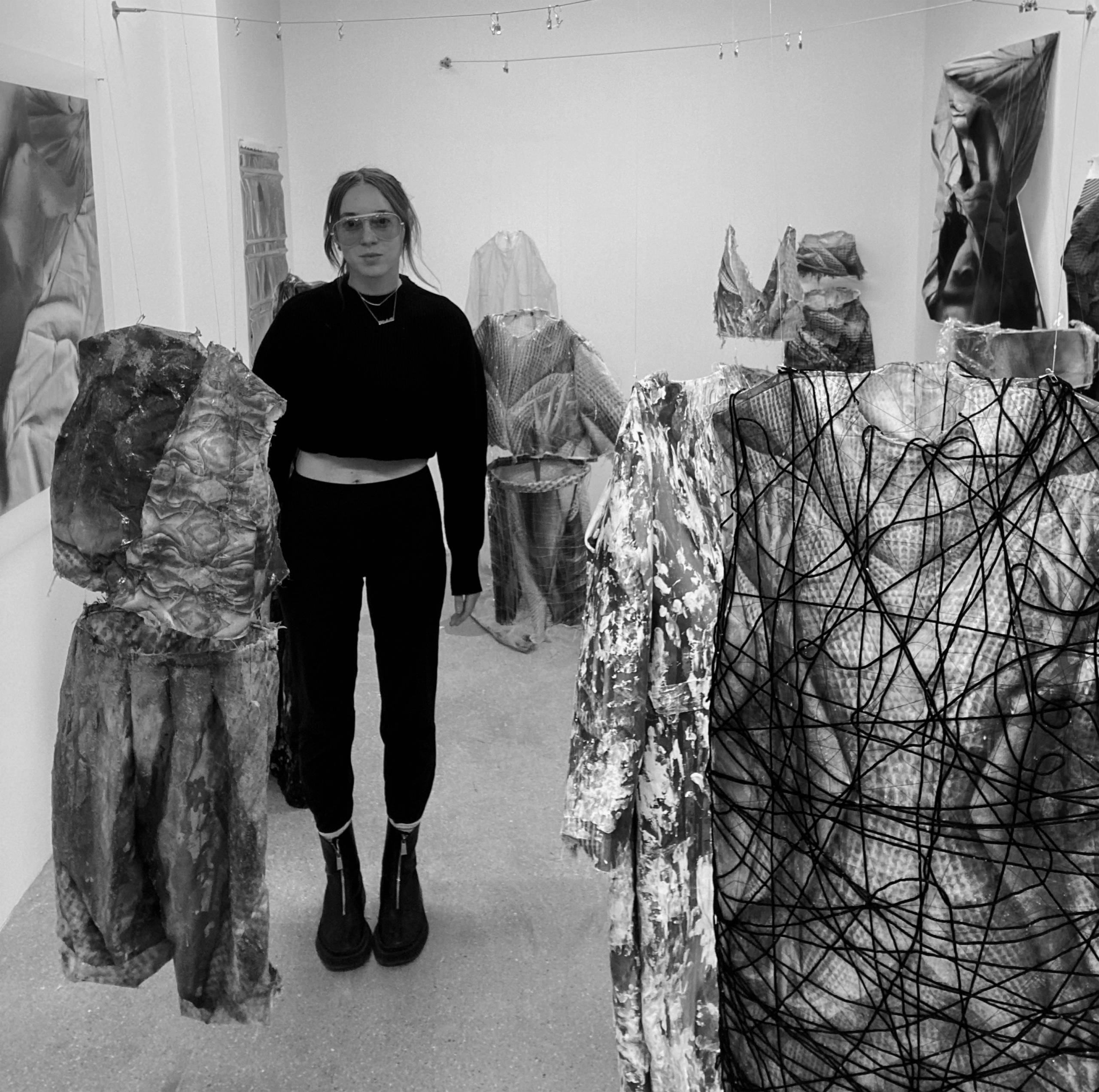 In my sculptures, garments become stand-ins for the body itself. I stretch them, pin them, harden them, or let them collapse. They carry the memory of being worn and the pressure that comes with it.