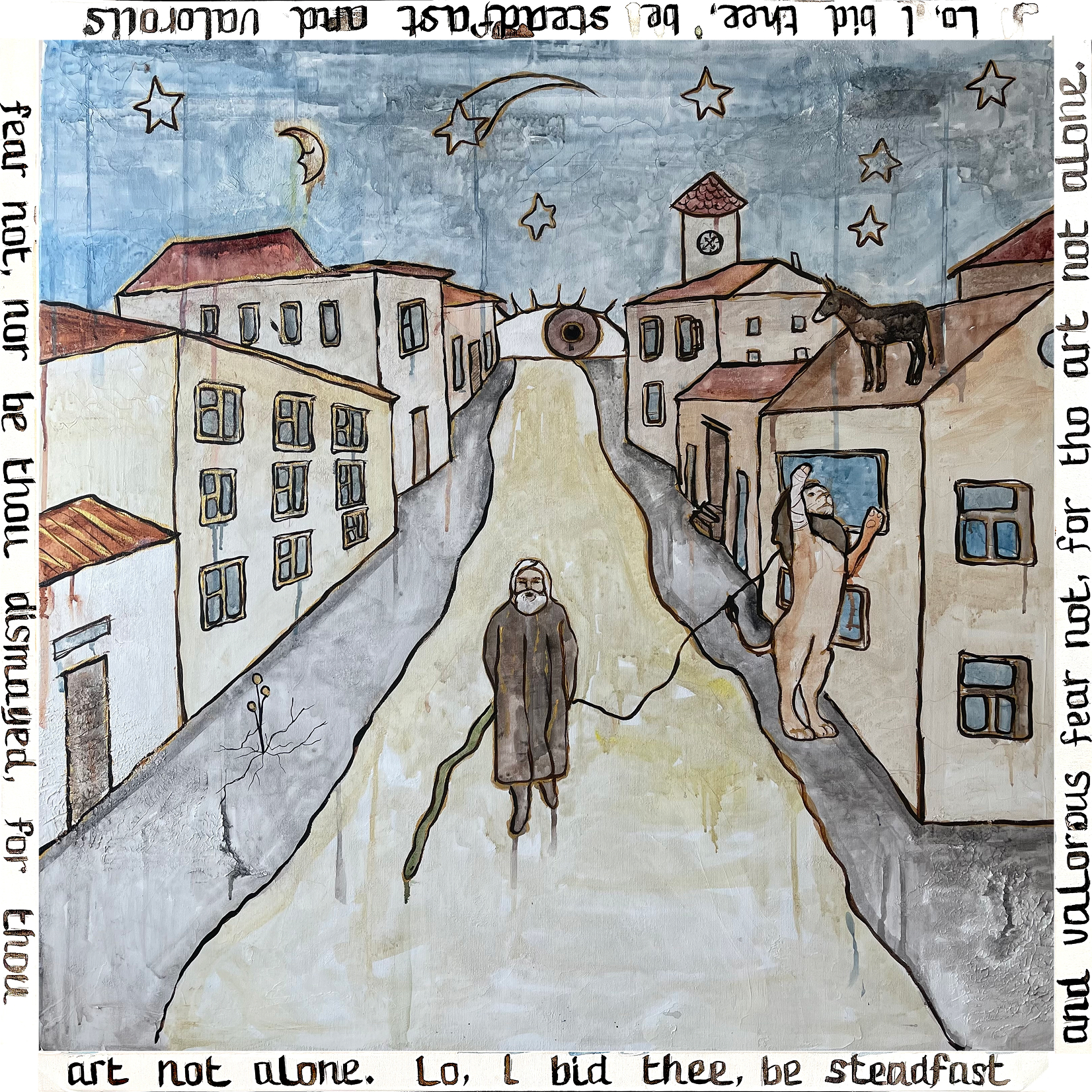 Puzikova’s current series of work may not scream for attention in a crowded room. It waits instead for those willing to look at it obliquely, to follow the writing around the edges of the canvases, and to see the hidden angels with their trumpets in the margins of our busy world.
