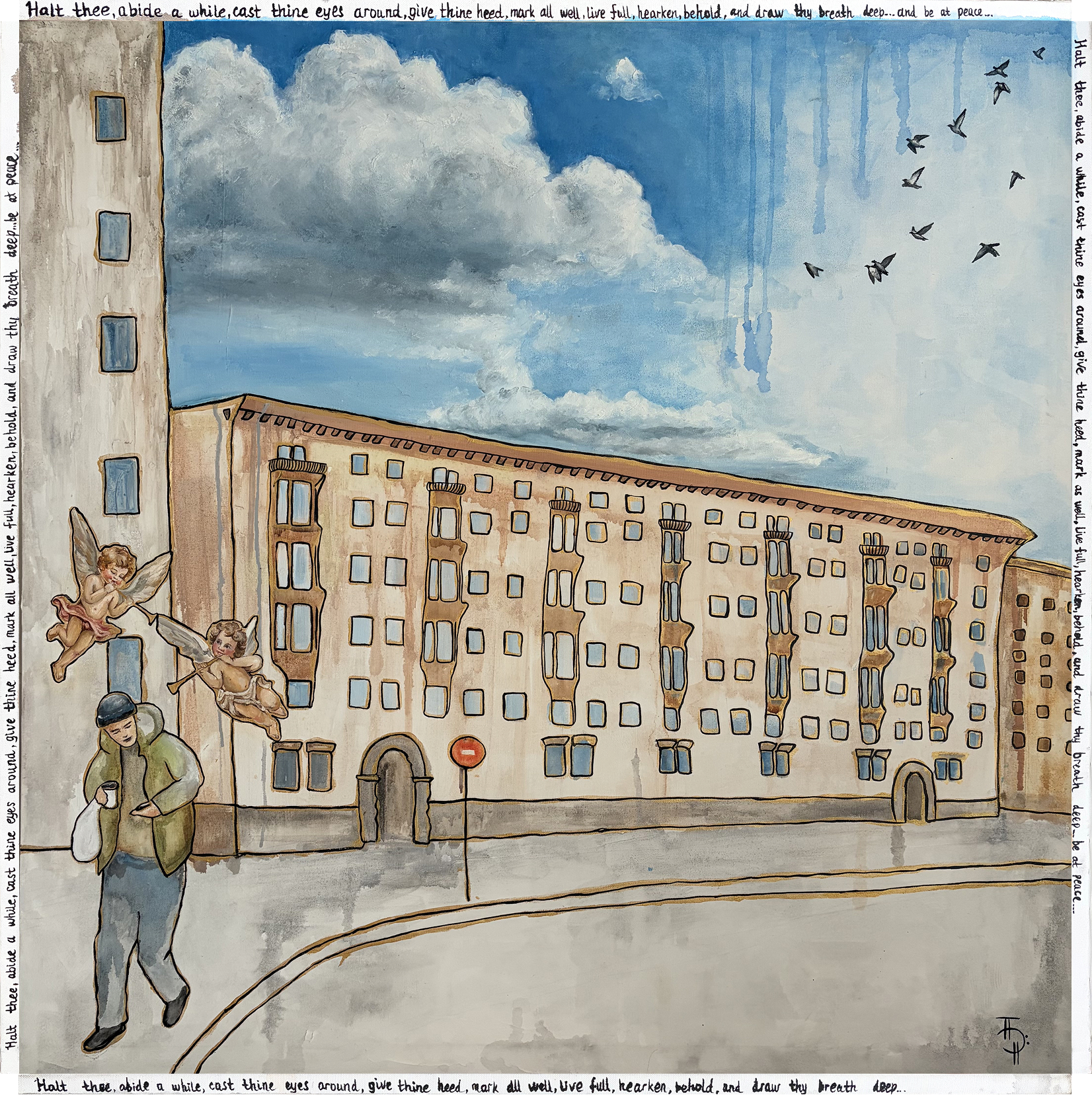 In the scene depicted in Olga Puzikova’s “The sky is blue.” (2026), a man is seen in haste walking past a stark and recognizable apartment block. He holds a coffee cup and is bent over in his haste to face whatever unseen burden awaits him in his morning commute. Yet floating above the pavement, unseen by the man in his haste, two cherubs blow trumpets into the cold air. To understand the scene properly, however, one must step to the side of the canvas. There, in archaic script along the side of the canvas itself, is written: “Halt thee, abide a while, cast thine eyes around… behold, and draw thy breath deep.” This is not only a demand upon the viewer but is itself emblematic of Puzikova’s journey as an artist. Born in Samara and currently residing in Dubai, Puzikova’s work is marked by the tremendous displacement of immigration and the personal displacement of motherhood. These kinds of tectonic shifts in life often serve to cleave an artist’s work in two. For Puzikova, however, it seems to have distilled it into something more essential. Having moved away from more broadly hopeful work, Puzikova’s more current work is marked by melancholy.