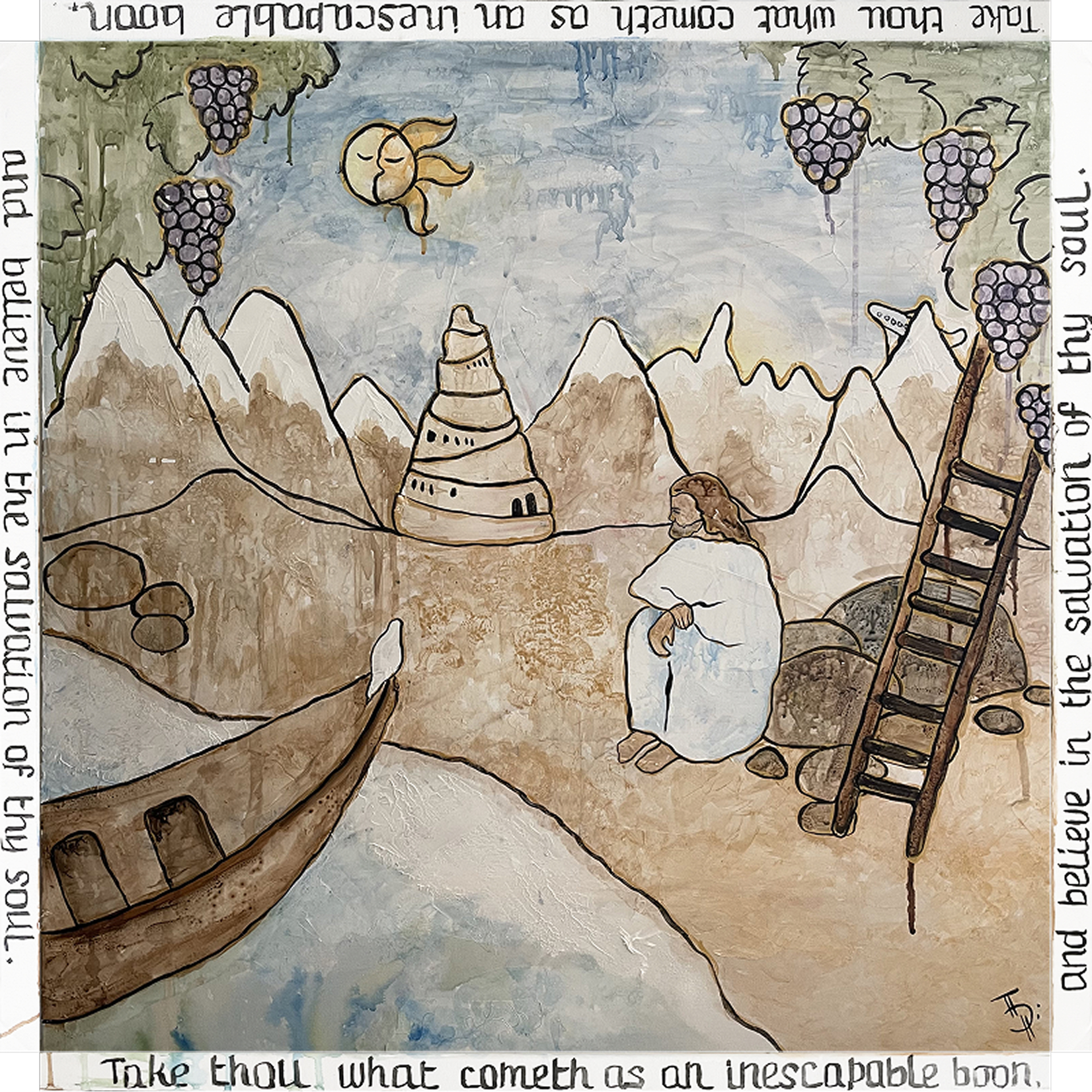 In her more representational work, such as “Catcher. (May the seeker be heard).” or “Between Hope and Despair,” there is a stillness and magic to her depictions of landscapes and solitary figures that reminds one of the work of Peter Doig in his more ethereal moments. A lone boat, a ladder leaning against a mysterious terrain; it is archetypal subject matter stripped of its grandeur and left with only its longing.