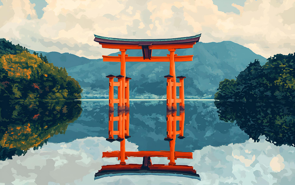 - The torii gate, the vermilion threshold that marks the entrance to a Shinto shrine and functions as a compact symbol of sacred passage.