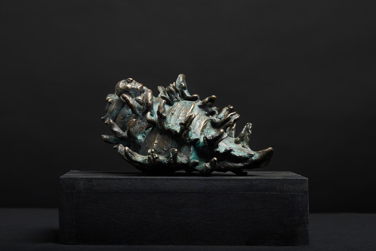 “Memory of the Sea” is created using metal casting and heat coloring techniques. By placing a human figure alongside a seashell, the work explores the relationship between memory and spatial perception. When familiar landscapes are removed from their original context, individuals are prompted to reconnect with their surroundings. The piece continues Zheng’s practice of bringing together Eastern and Western artistic languages while linking material with personal experience.