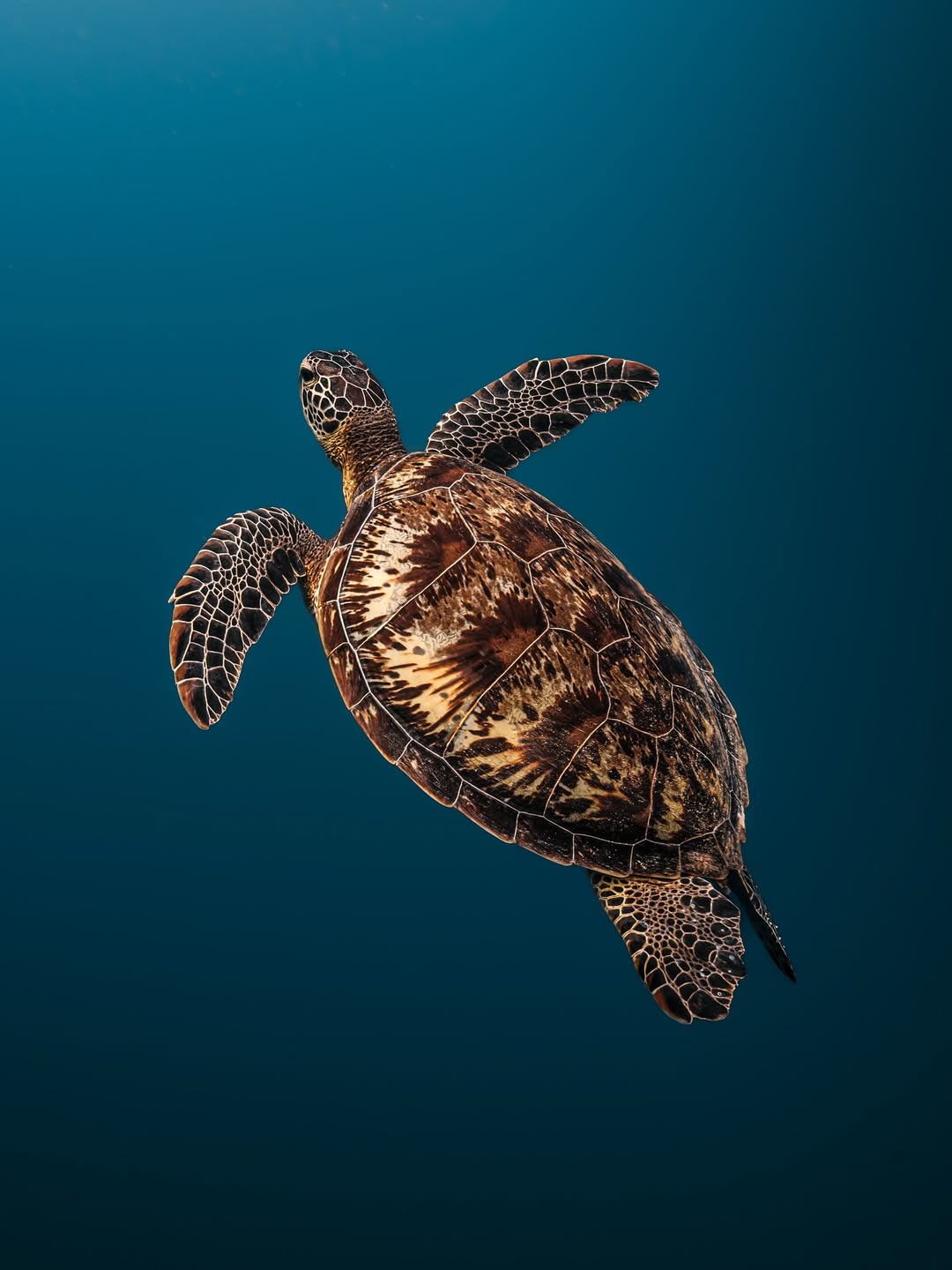 Megan Shea-Graff‘s overhead perspective centers the intricate geometry of a hawksbill’s carapace. The species is distinguished by its overlapping scutes which create the distinctive tortoiseshell pattern that has made these animals targets of exploitation for centuries. Despite international trade bans since 1977, illegal poaching for shells continues to this day, contributing to the species’ critically endangered status.