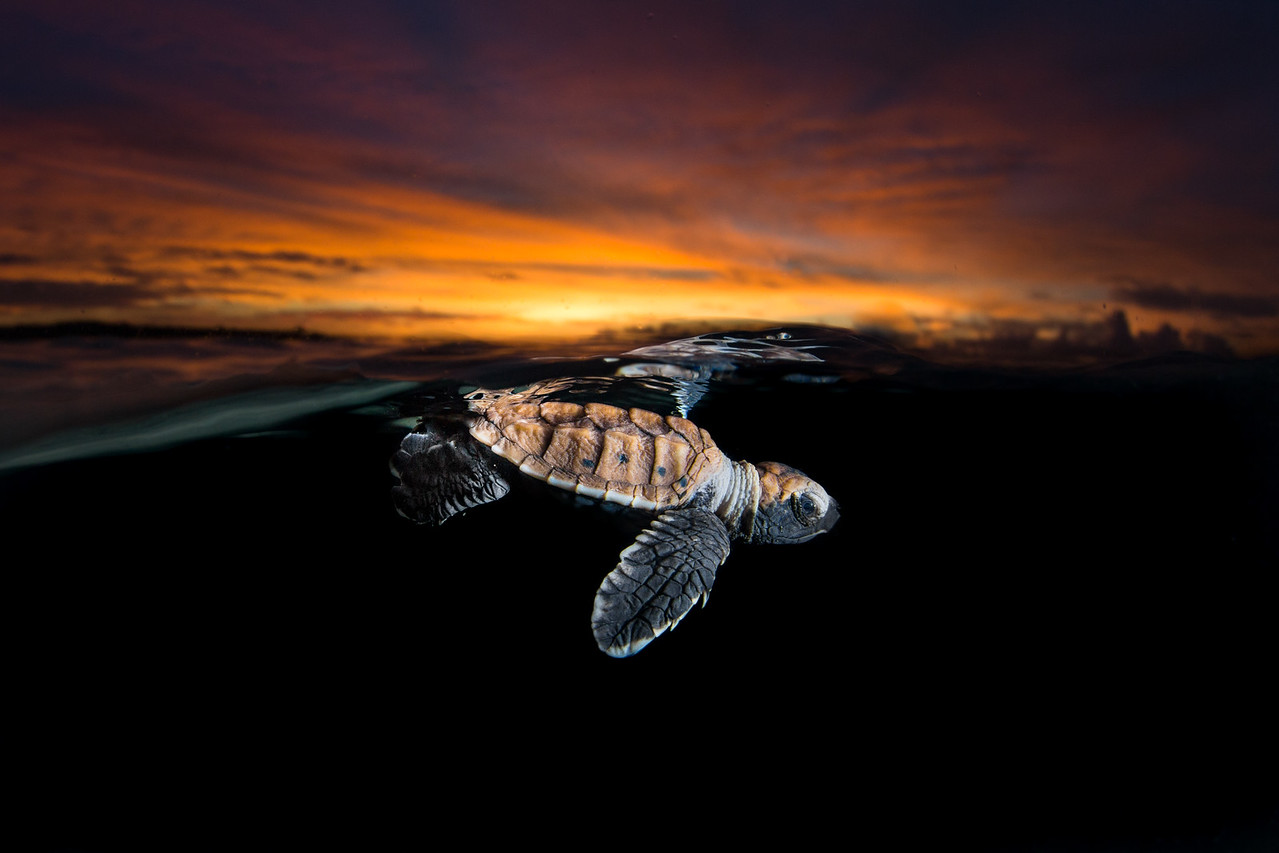 Grant Thomas captures a hatchling suspended between worlds in this dramatic split-level composition. His collection of high-contrast turtle images reflects what he describes as the uniquely meditative quality of photographing these creatures — their slow, deliberate grace offering photographers time to perfect their composition when mutual respect is maintained.